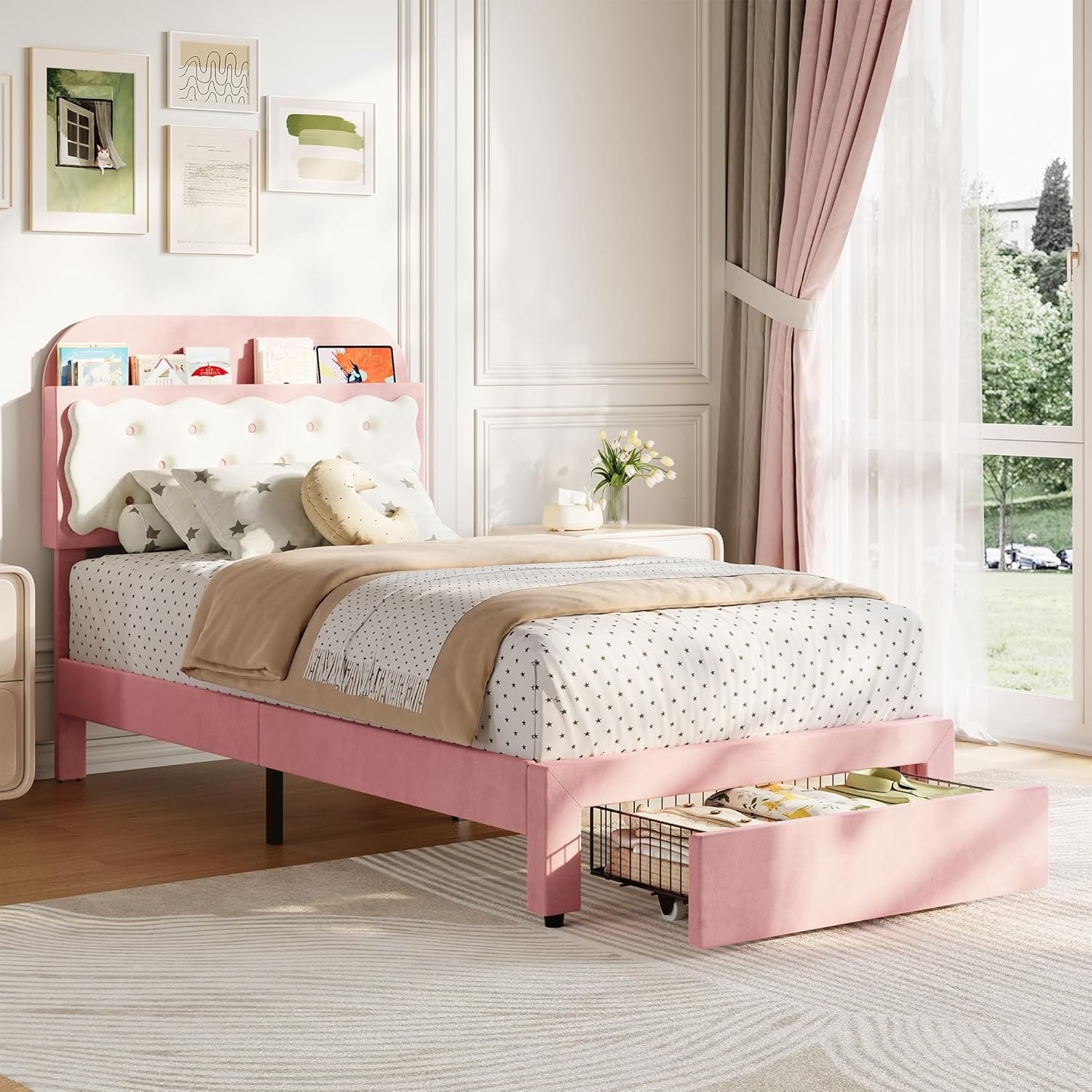 Upholstered Platform Bed Frame with Storage Headboard and Drawer, Wood Slats Support