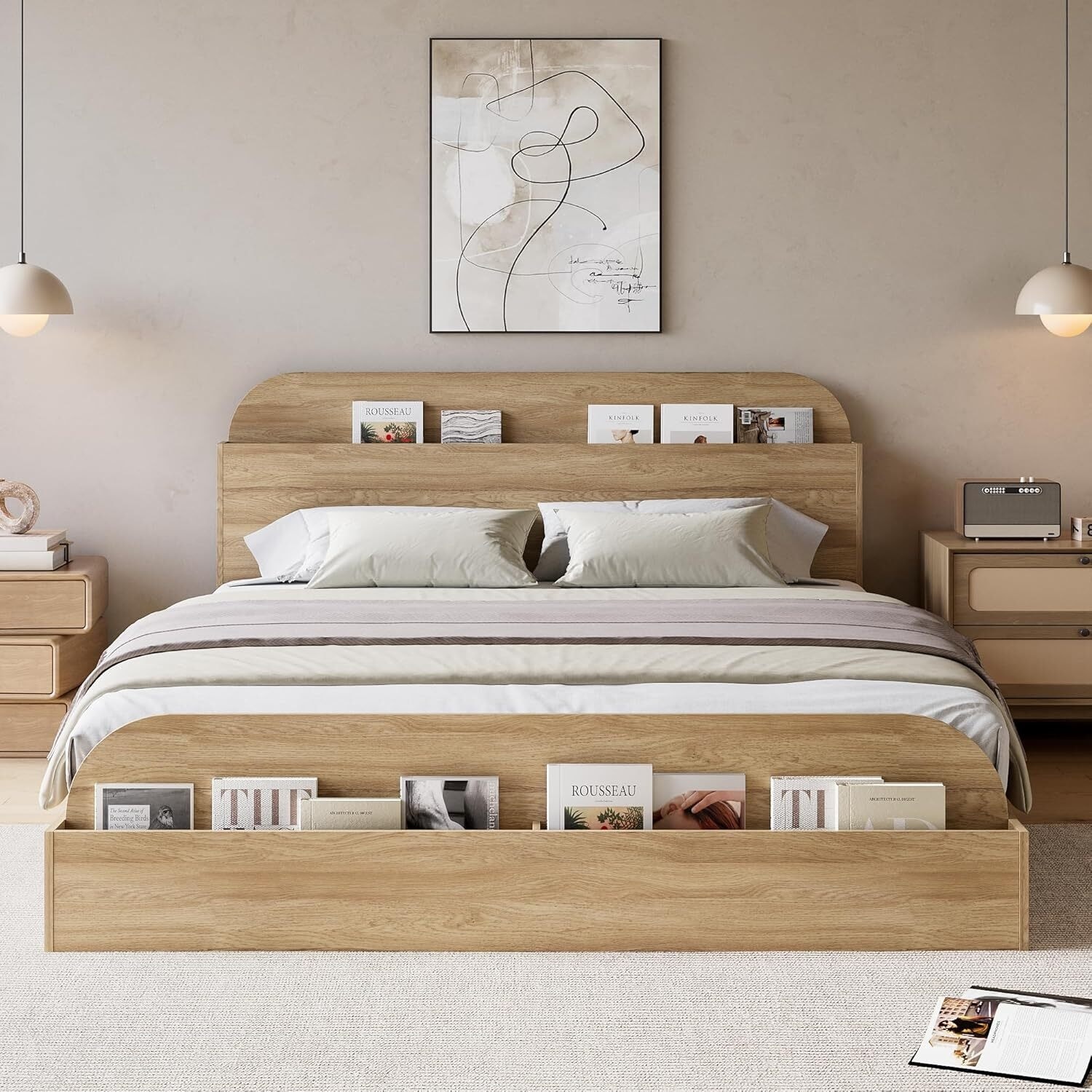 Wooden Platform Bed Frame with Storage Headboard and Footboard, Natural