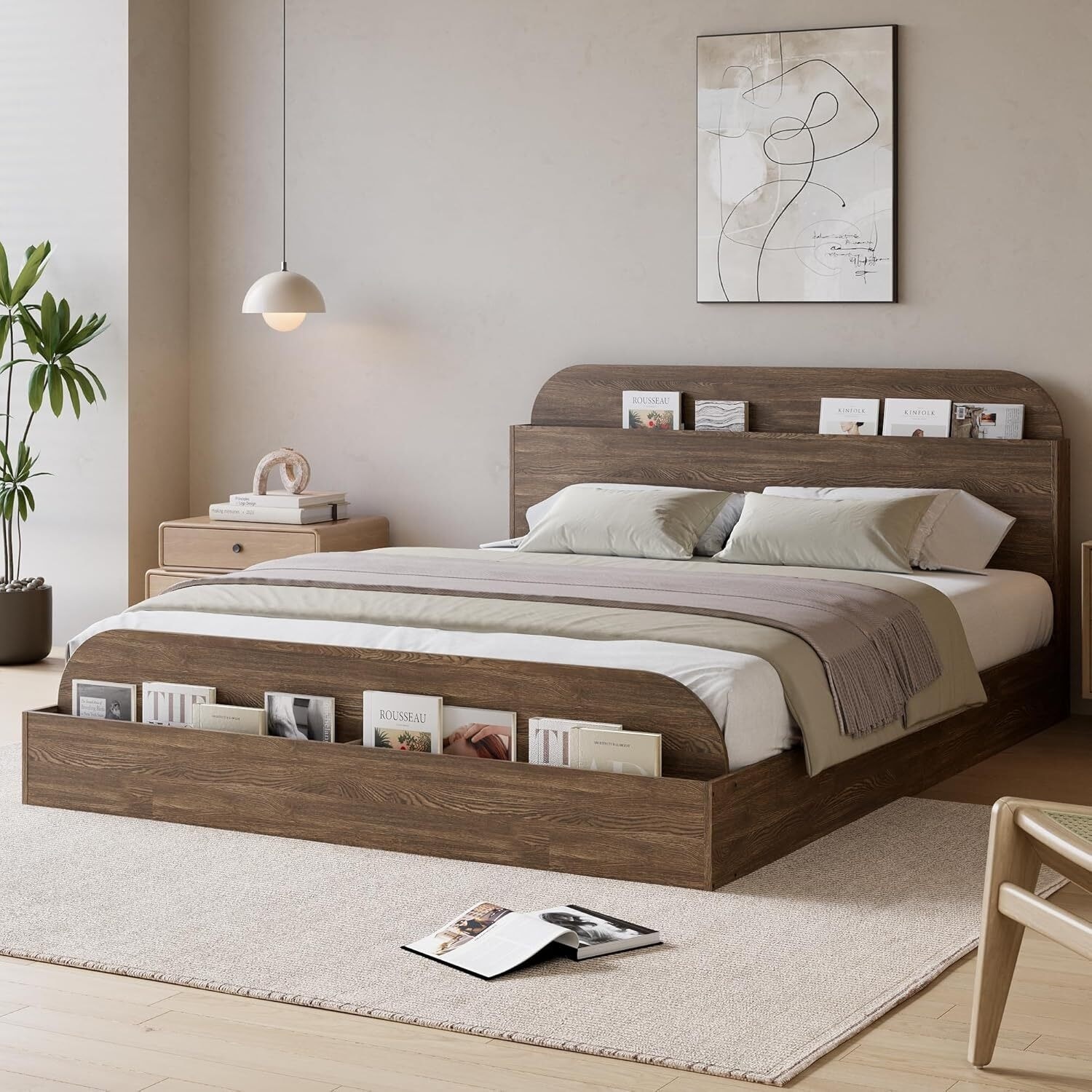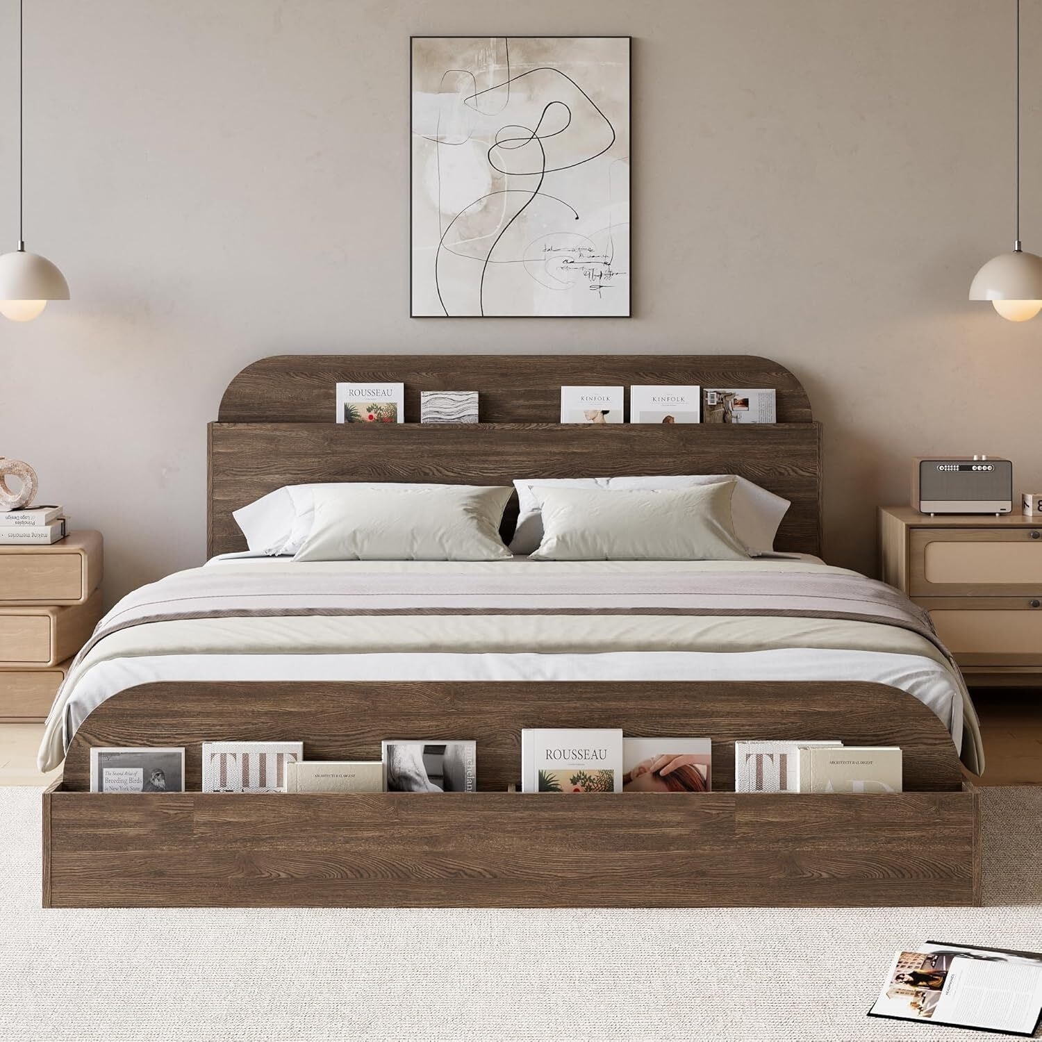 Wooden Platform Bed Frame with Storage Headboard and Footboard, Walnut