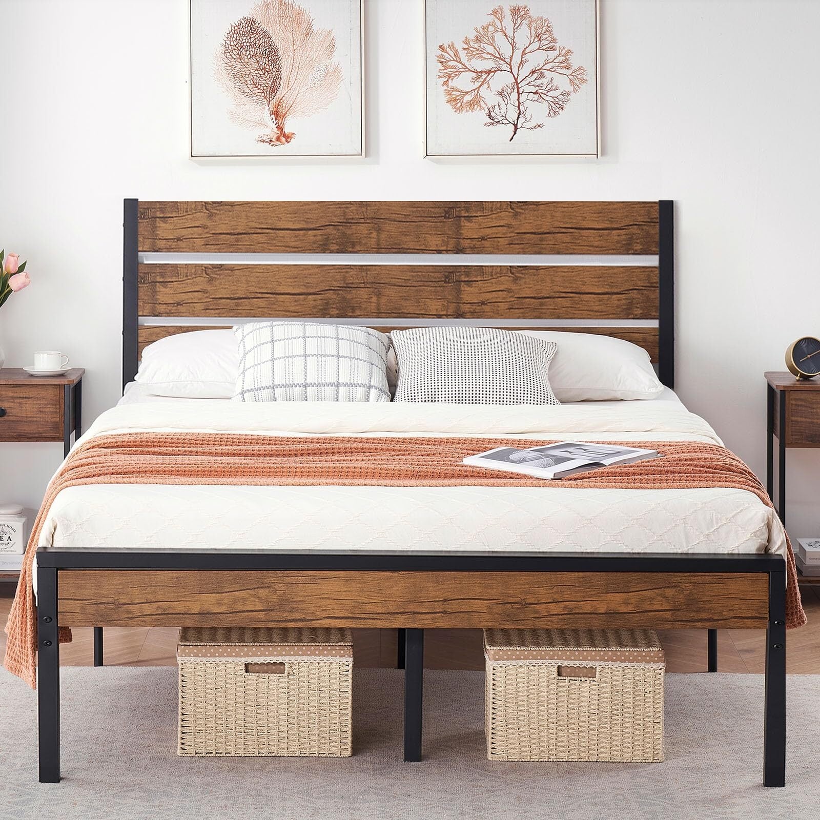 Full/Queen Size Metal Bed Frame with Rustic Wood Headboard