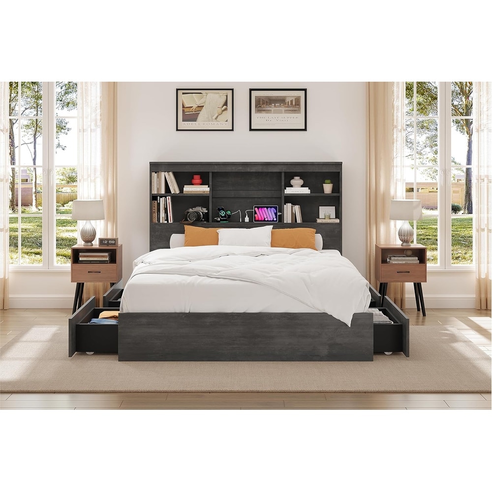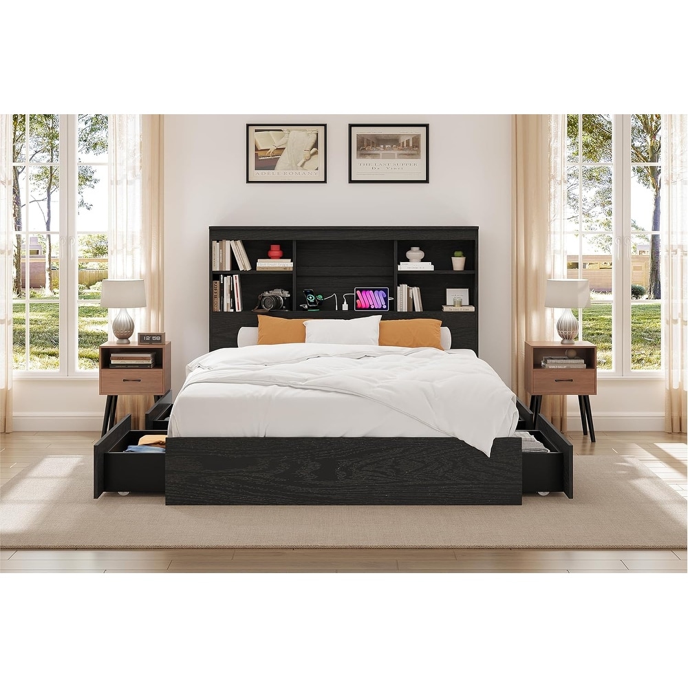 Bed Frame with Bookcase Headboard, Storage Drawers & Charging Station, Metal Platform Support