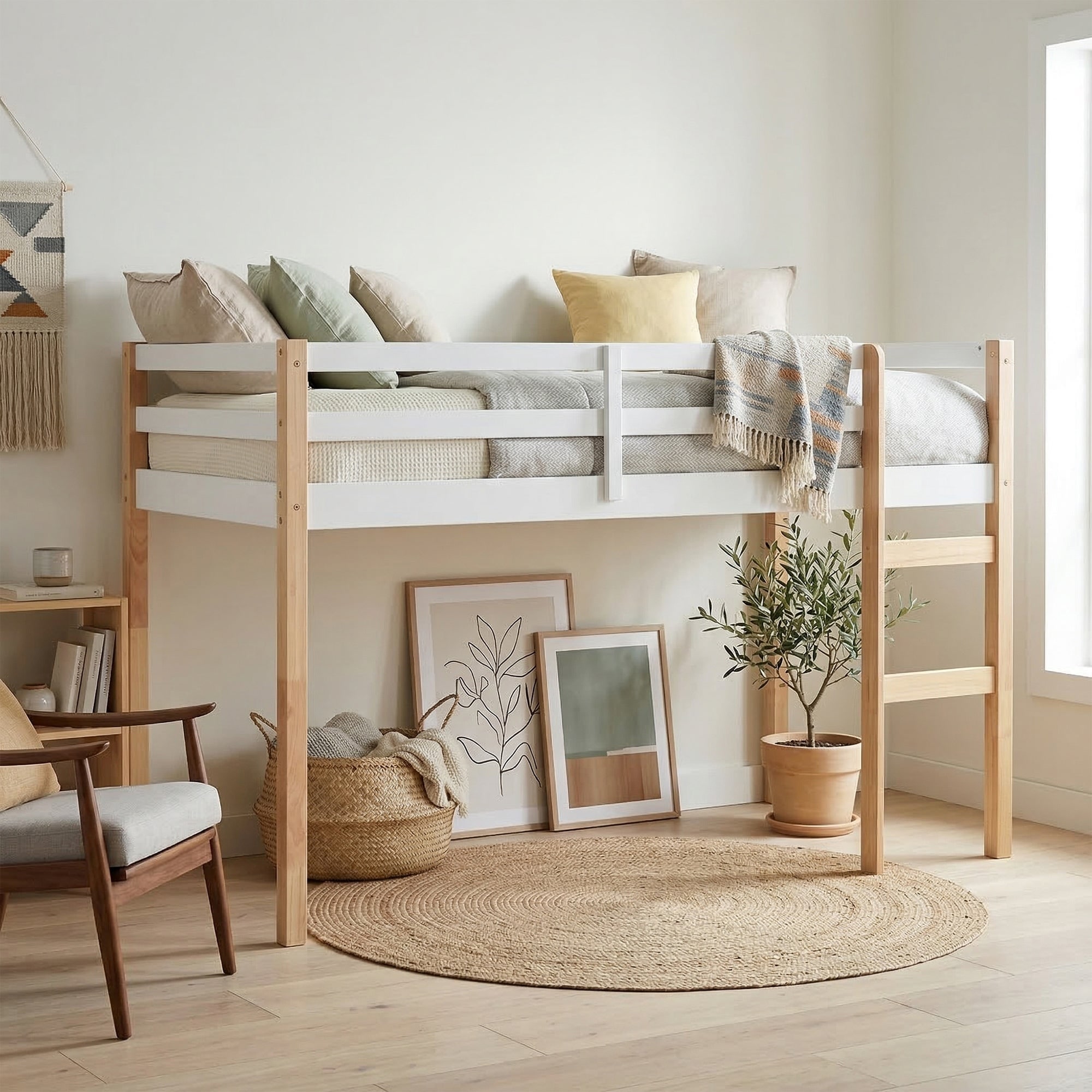 Twin Size White Rubberwood Loft Bed with Stairs and Guardrails Staircase Bed with 29.6" Underbed Clearance Space Saving Loft Bed