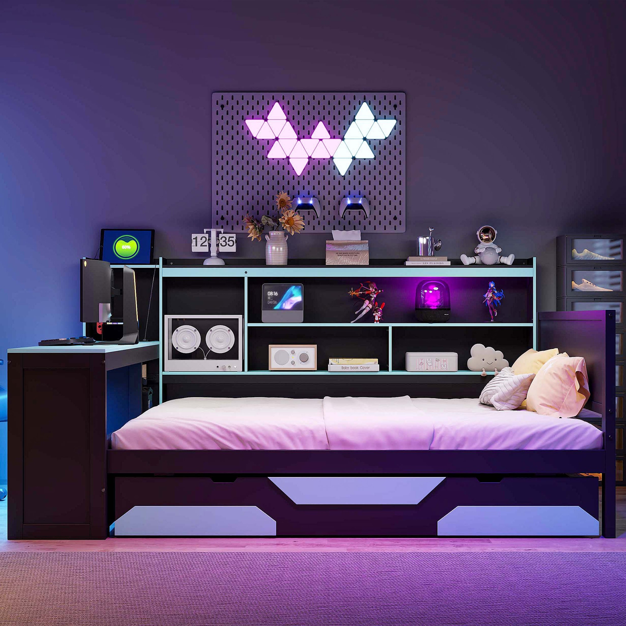 Roomfitters Full Gaming Daybed, Desk & LED Lights, Wood Frame, 3 Storage Units, Bookcase & Charging Stations