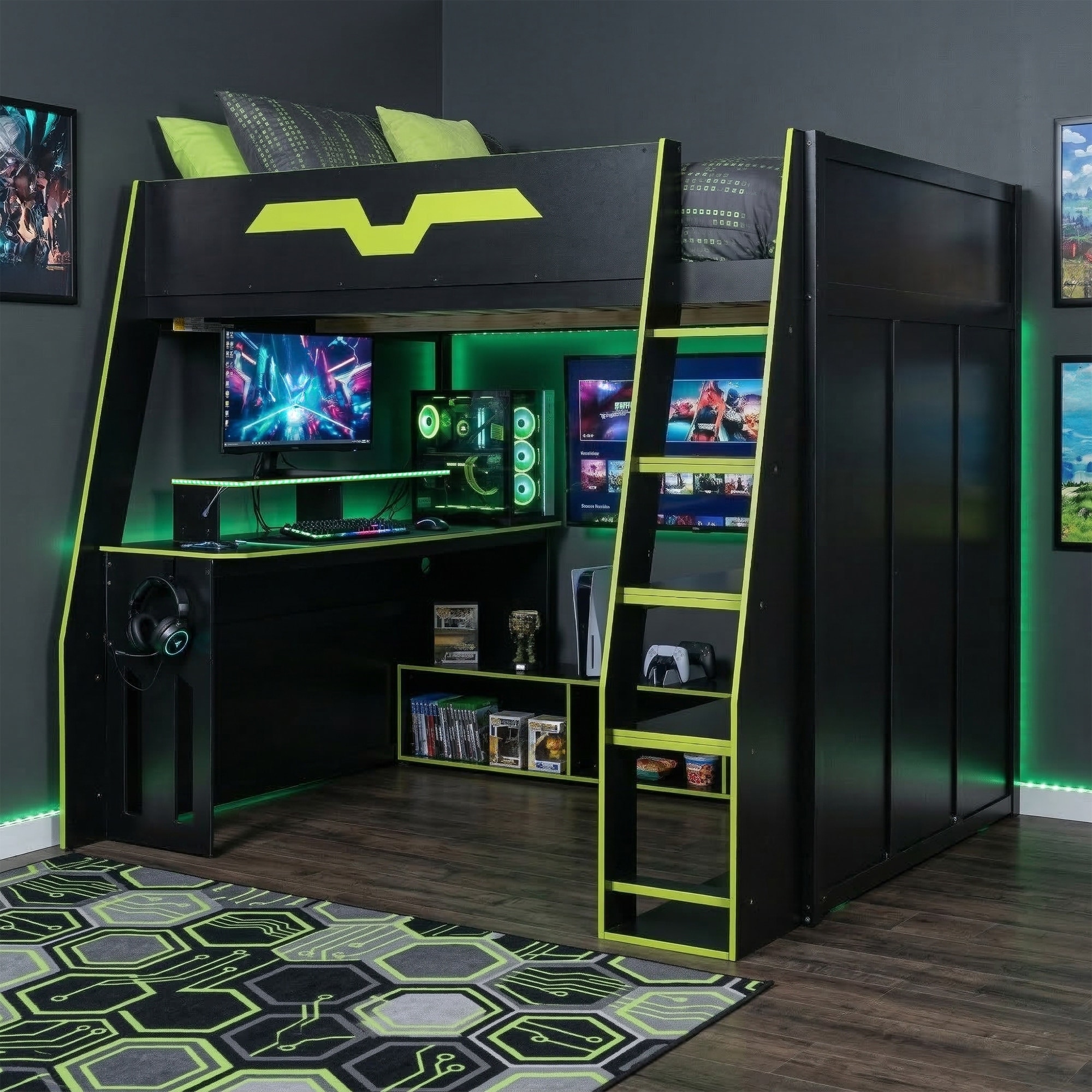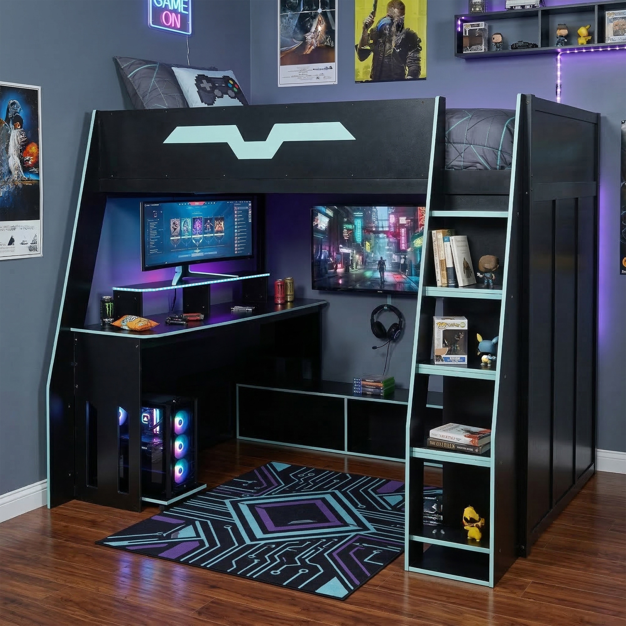 Roomfitters Full Wood Gaming Loft Bed, L-Shaped Desk & Media Shelving, Gamer Bed, RGB Lights & Console Hub