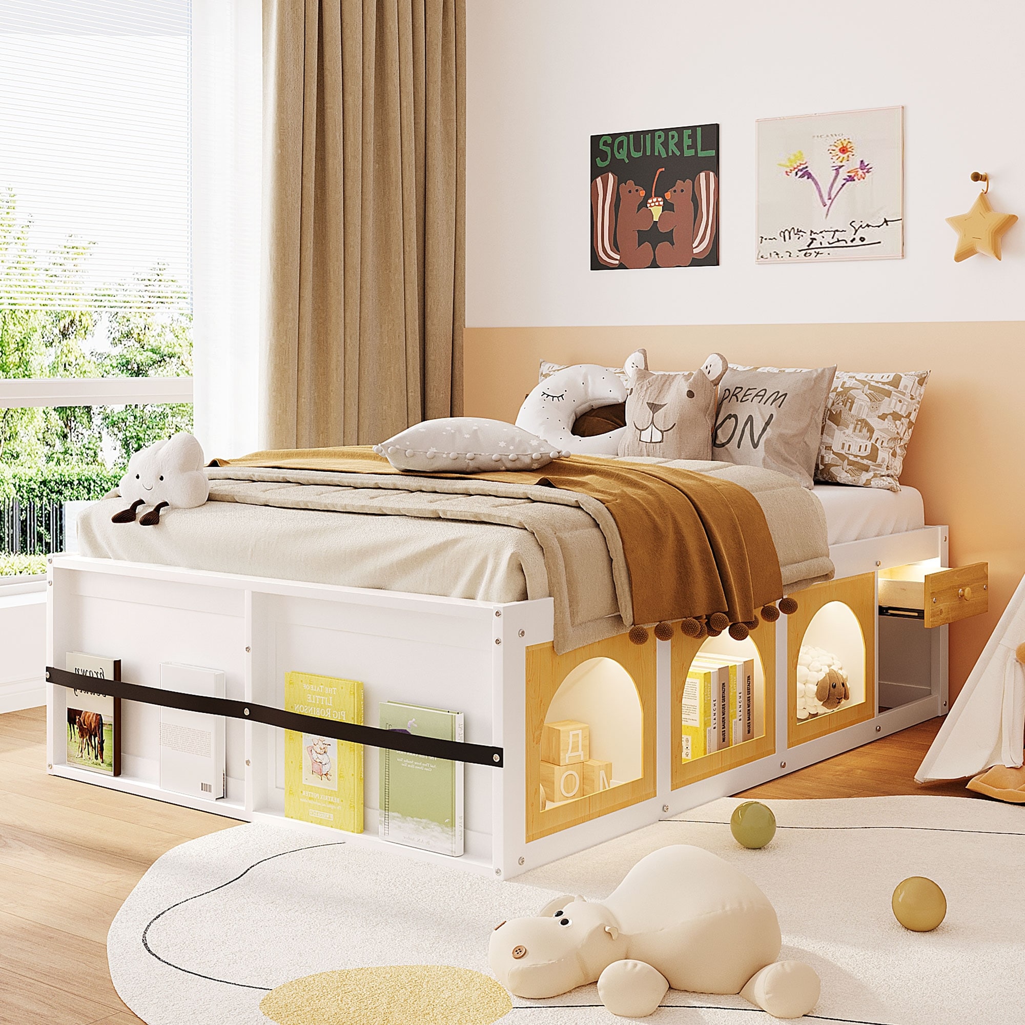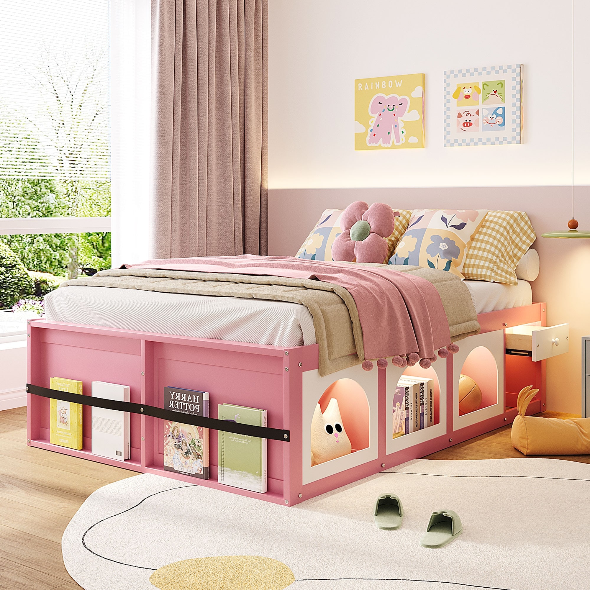 Full Size Wooden Platform Bed with Bookshelf, Display Cabinet, LED Light and Drawer
