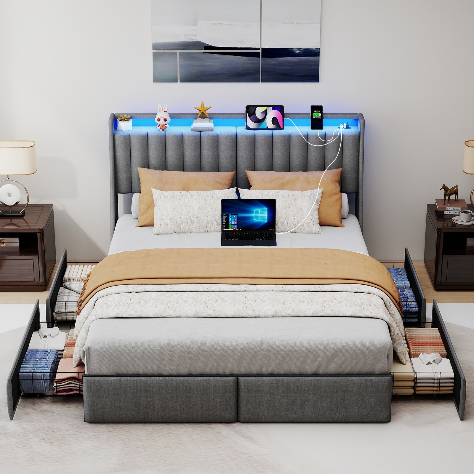 Full Size Upholstered Bed Frame with 4 Storage Drawers, LED Lights & Charging Station