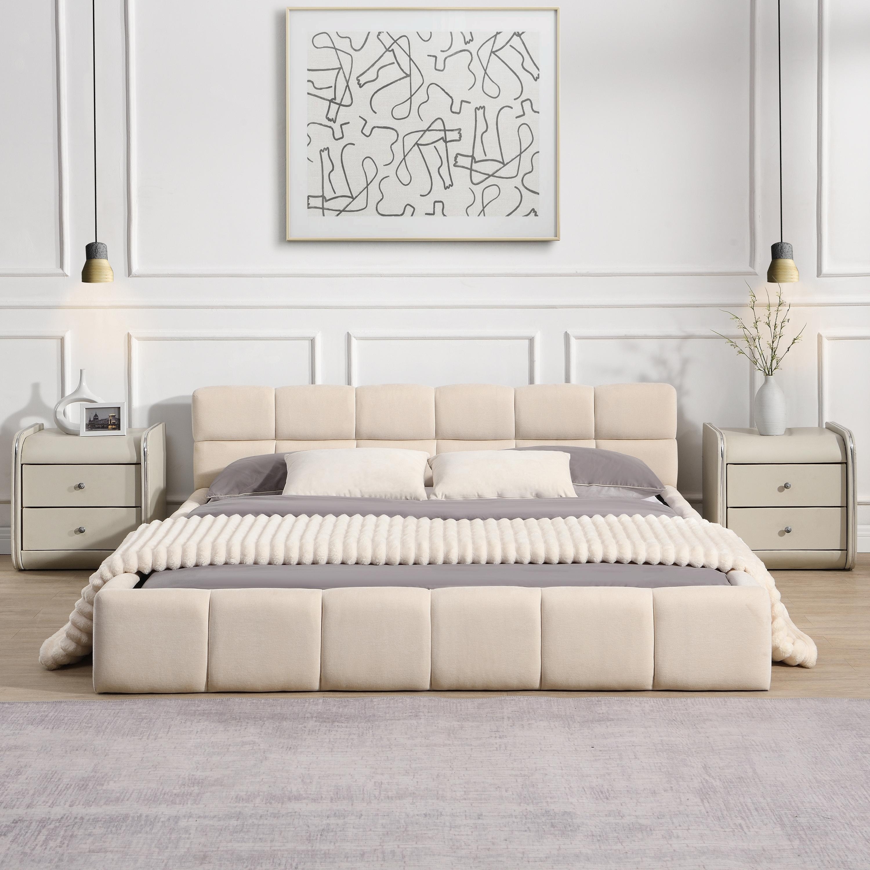 Elegant Beige Chenille Upholstered Bed with Checkerboard Pattern