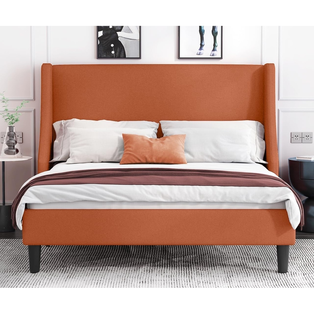 Modern Full Size Platform Bed Frame with Upholstered Headboard and Wood Slat Support, Burnt Orange