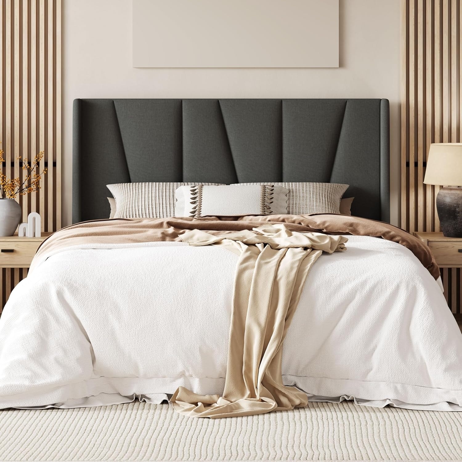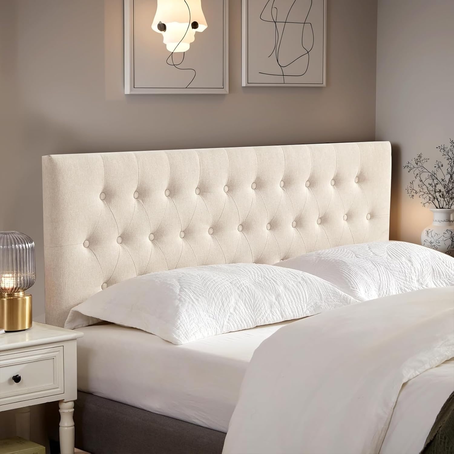 Modern Adjustable Height Linen Upholstered Headboard with Button Tufting, Queen Size, Textile Beige