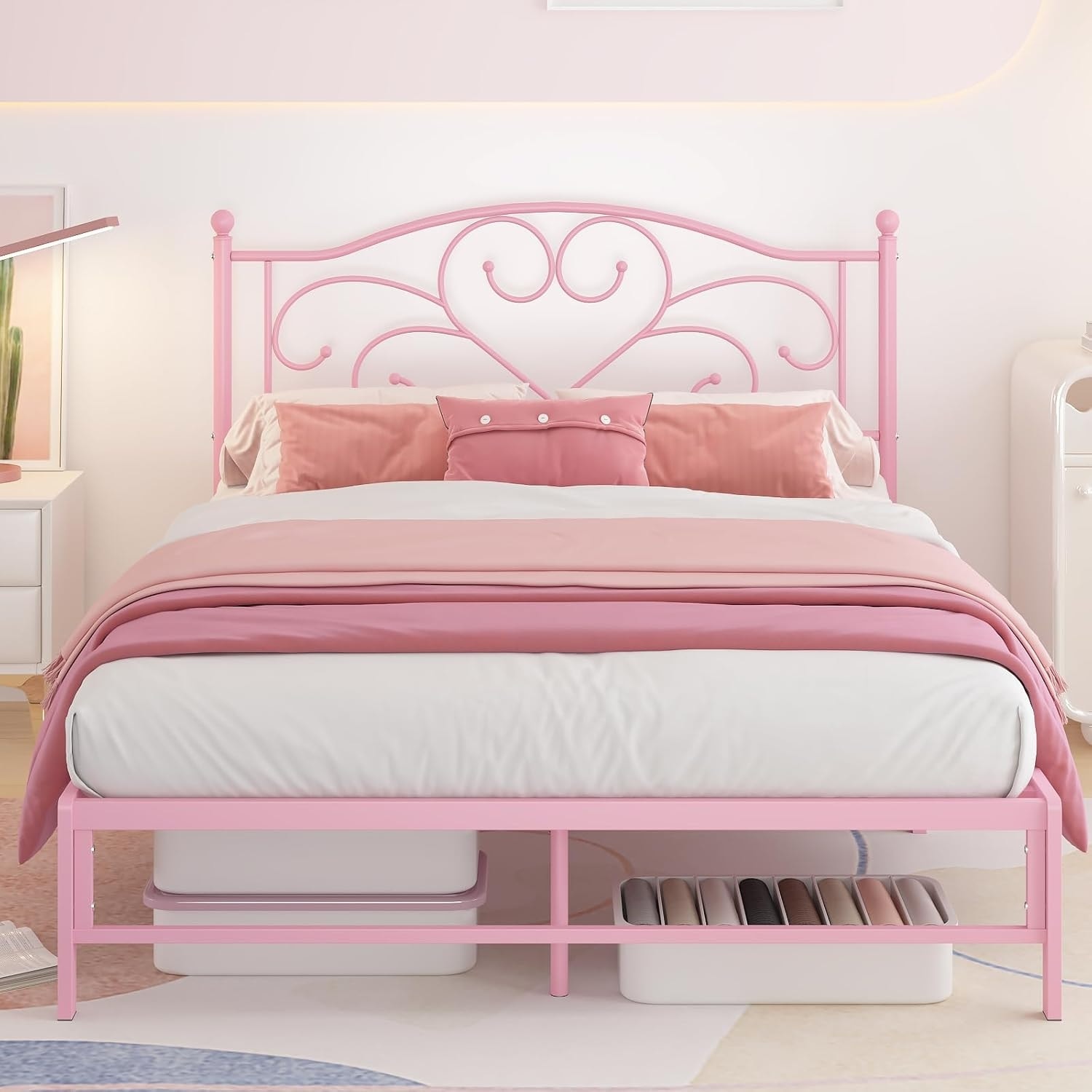 Full Bed Frame with Headboard, 11.2 Inch Storage, Easy Assembly, Pink