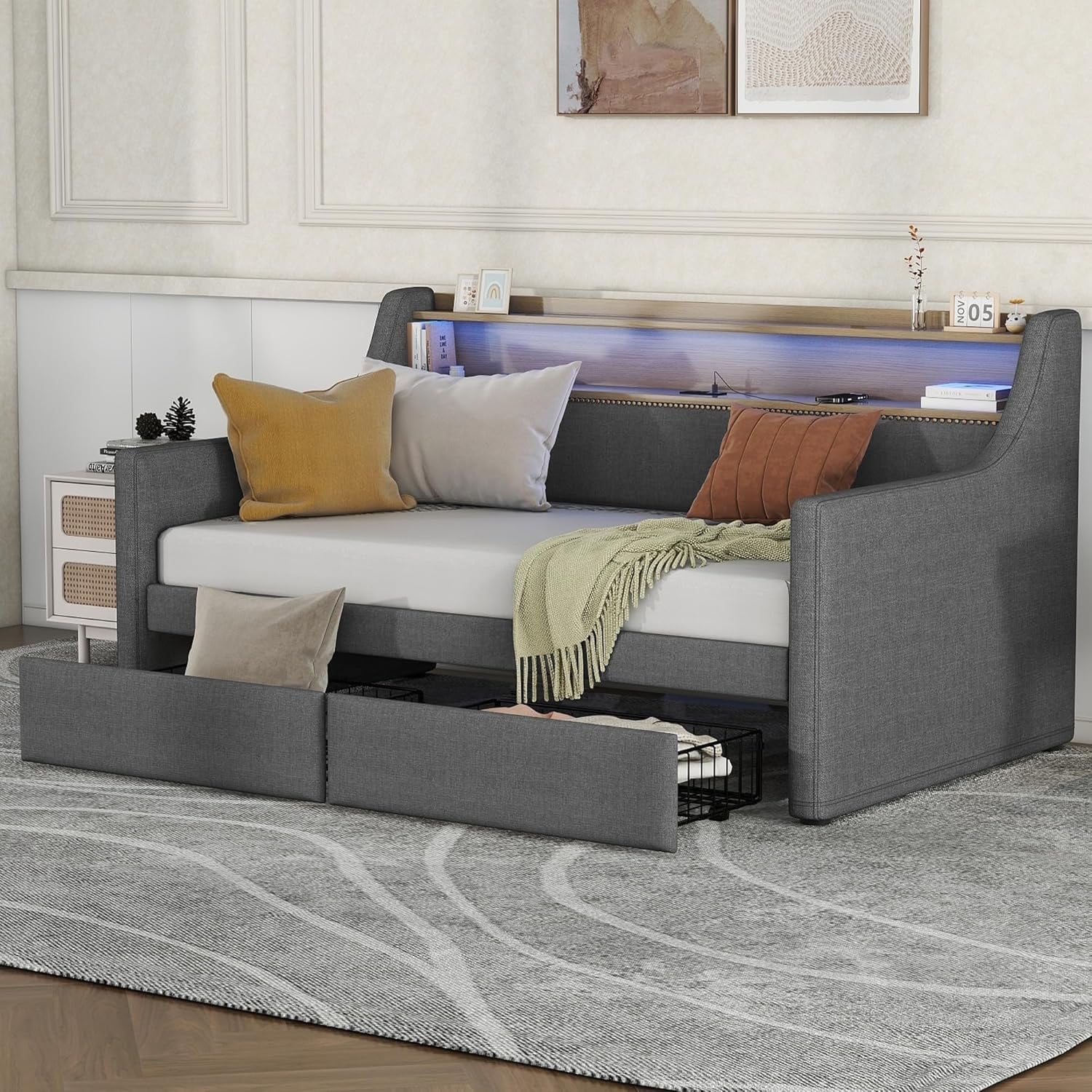 Twin Size Upholstered Daybed with LED Lights, Charging Station, Storage Drawers, and Sturdy Metal Frame