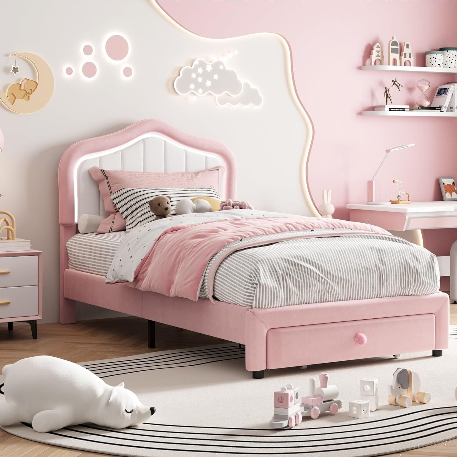 Twin Upholstered Platform Bed Frame with LED Lights & Storage Drawer, Easy Assembly