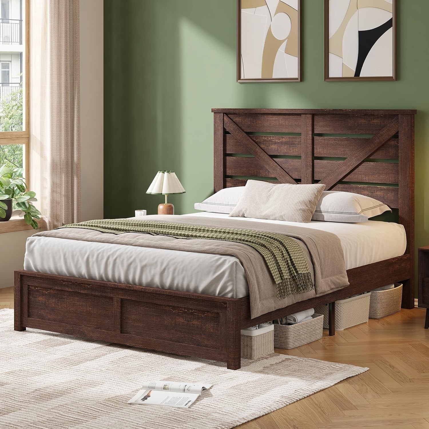 Full Size Farmhouse Wooden Platform Bed Frame with Barn Door Headboard, No Box Spring Needed