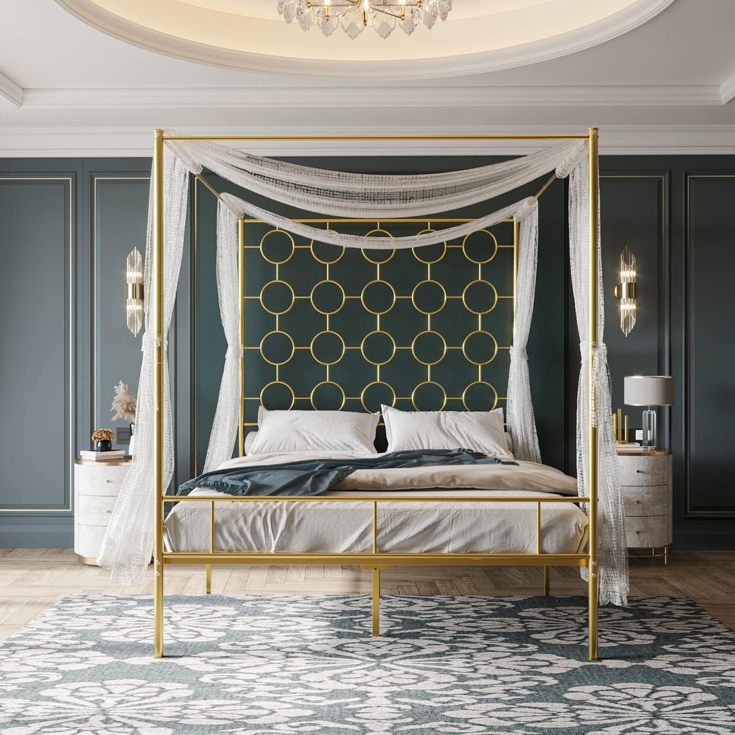 Gold Metal Canopy Bed Frame Queen, Mattress Foundation with Steel Slat Support, No Box Spring Needed, Easy Assembly