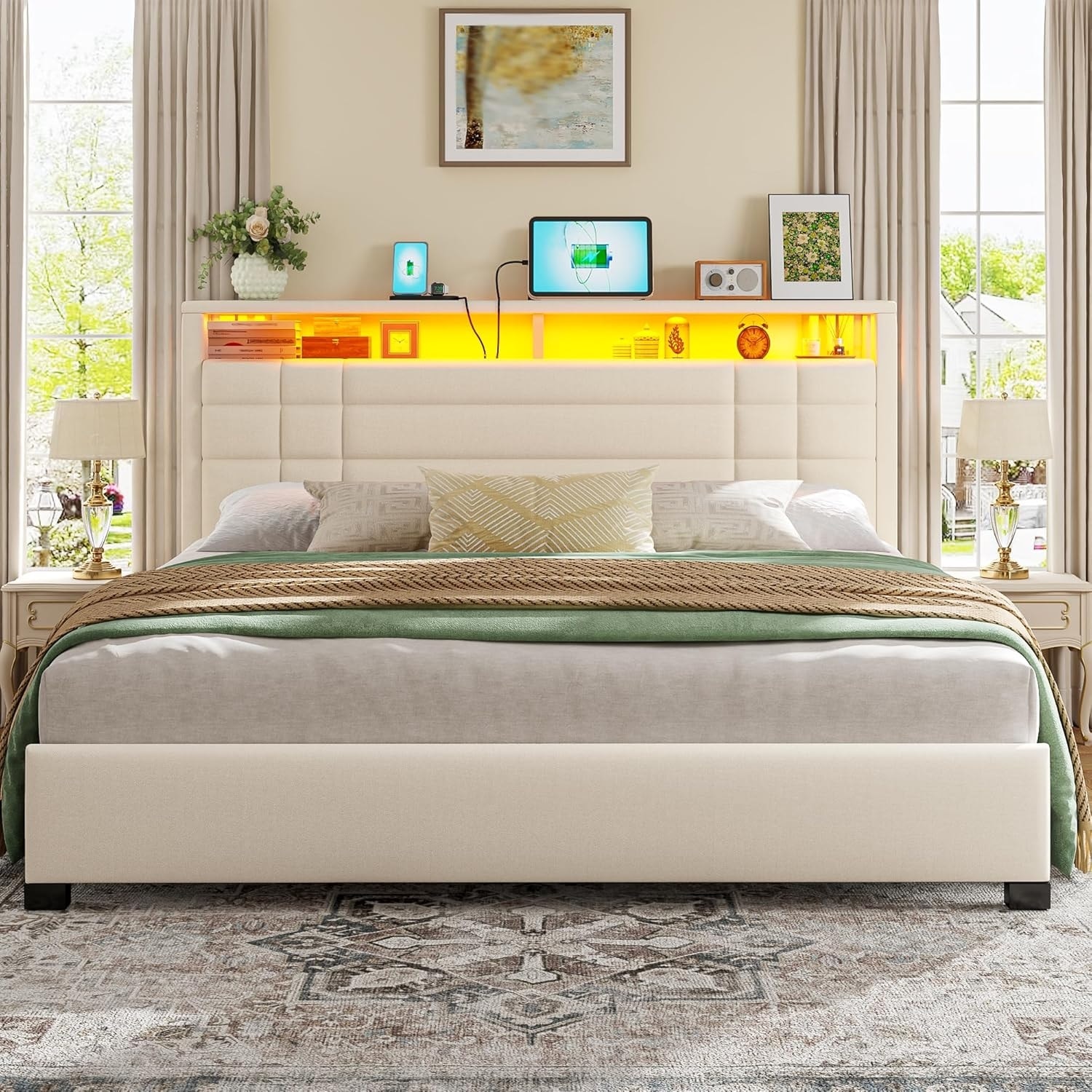 King Size Bed Frame with 2-Tier Storage Headboard, RGB LED Lights, 3 Charging Ports, Sturdy Metal Slats, Noise-Free Design