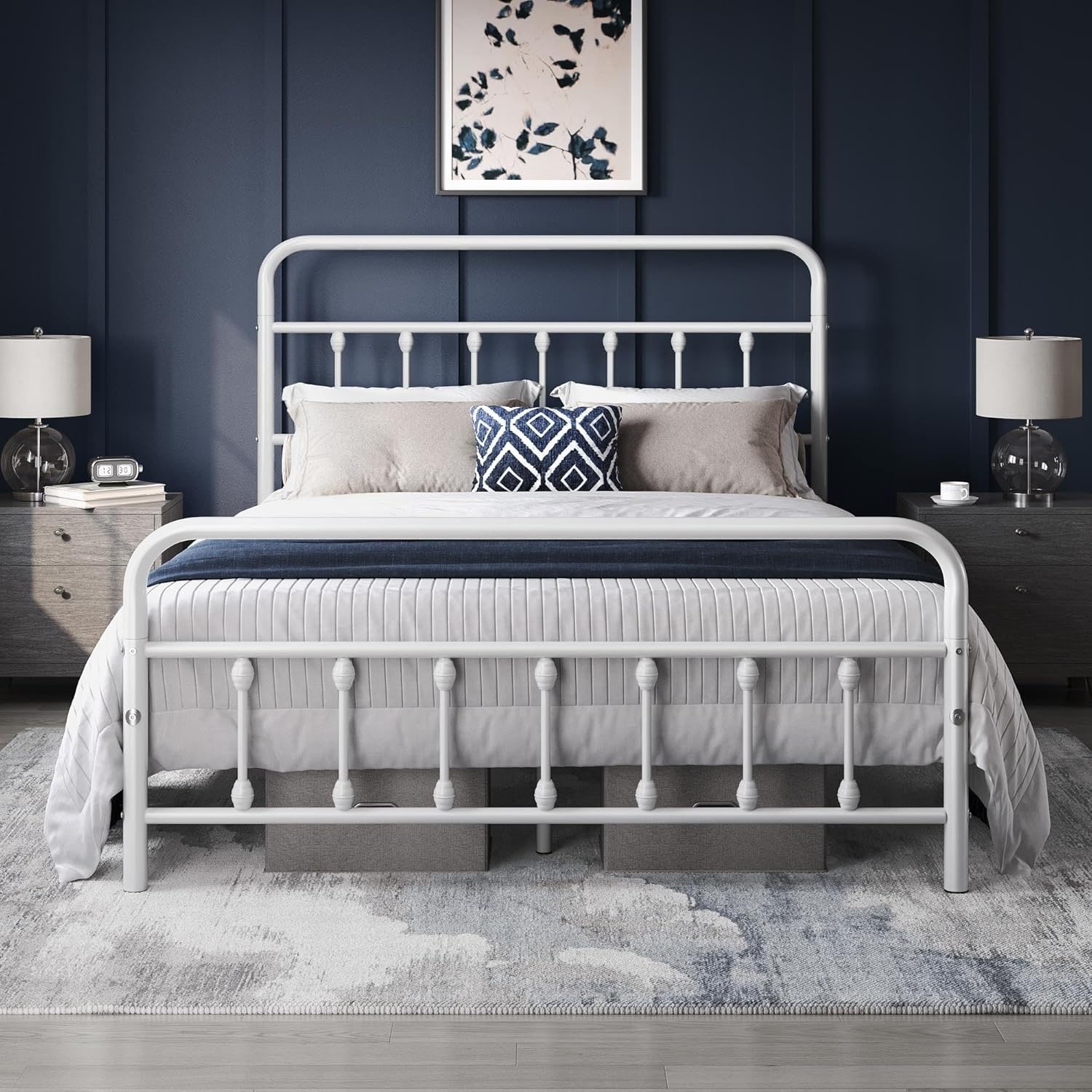 Classic Metal Platform Bed Frame with Victorian Style Iron-Art Headboard, Full Size White