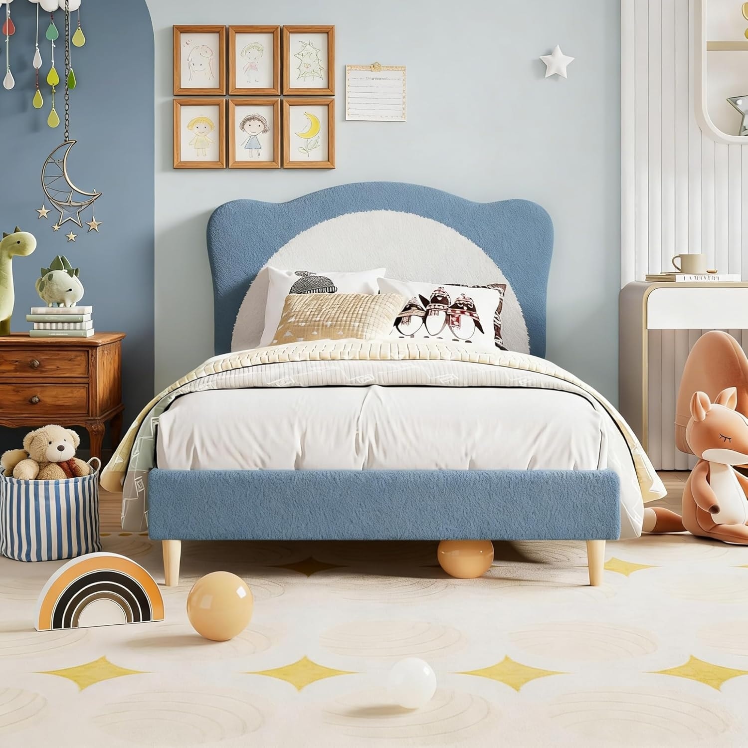 Twin Kids Princess Bed Frame Panda Velvet Headboard Blue White