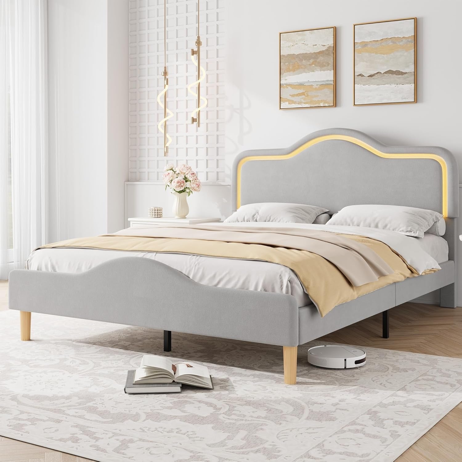 Queen Bed Frame Vintage Style Gray Fabric Platform Bed Modern Bedroom Furniture