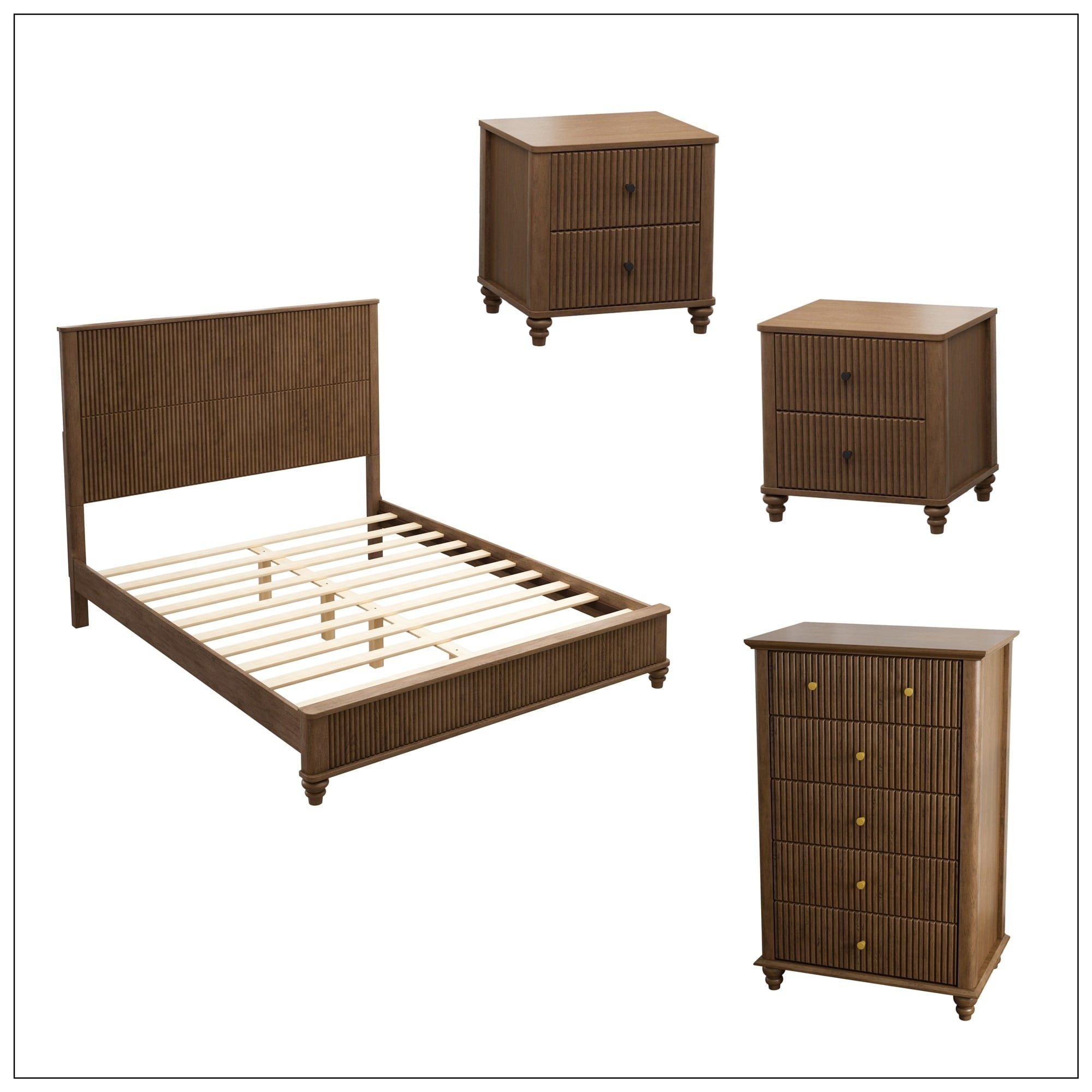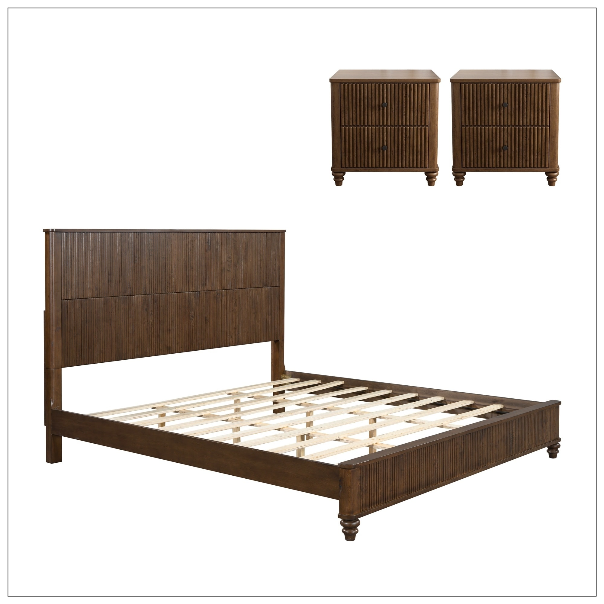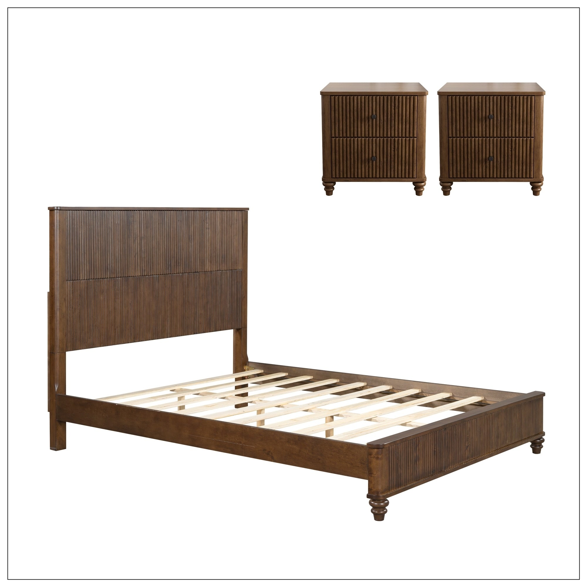 3pc Bedroom Set Dark Walnut Finish Solid Rubberwood Bed Nightstand Chest