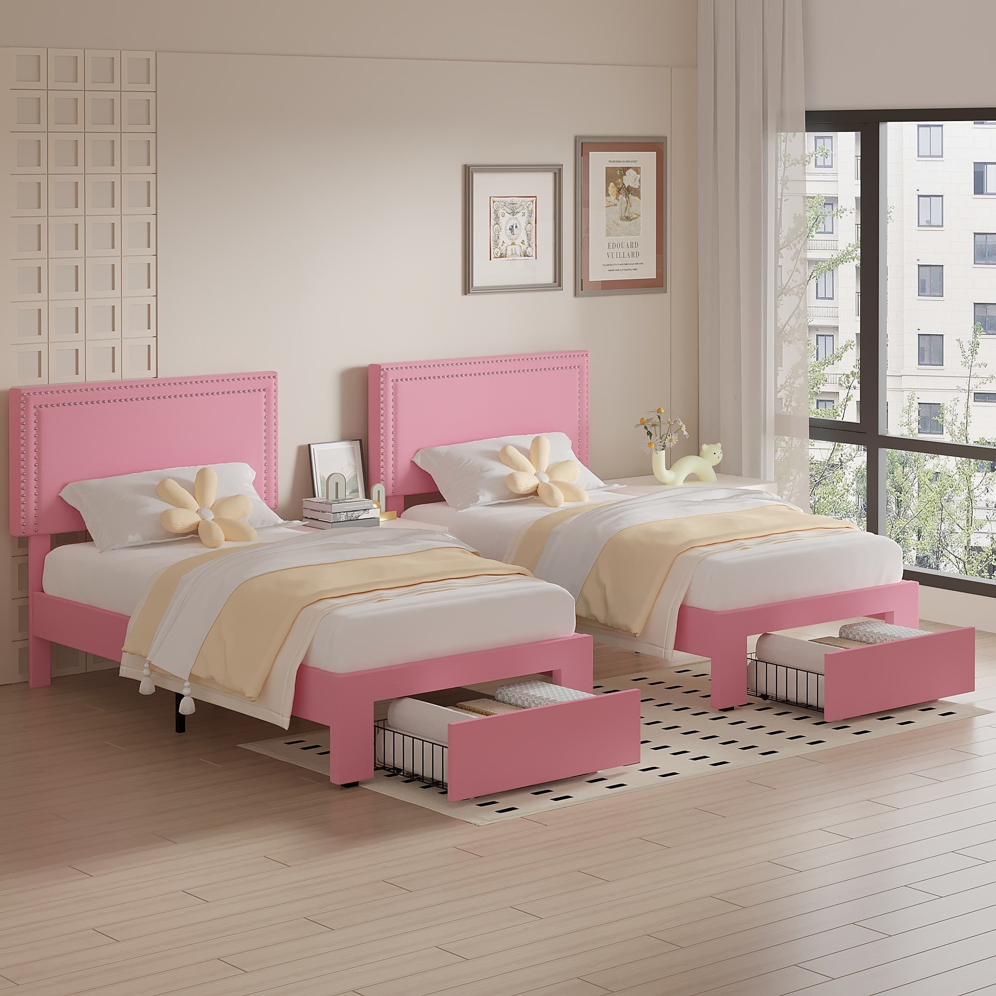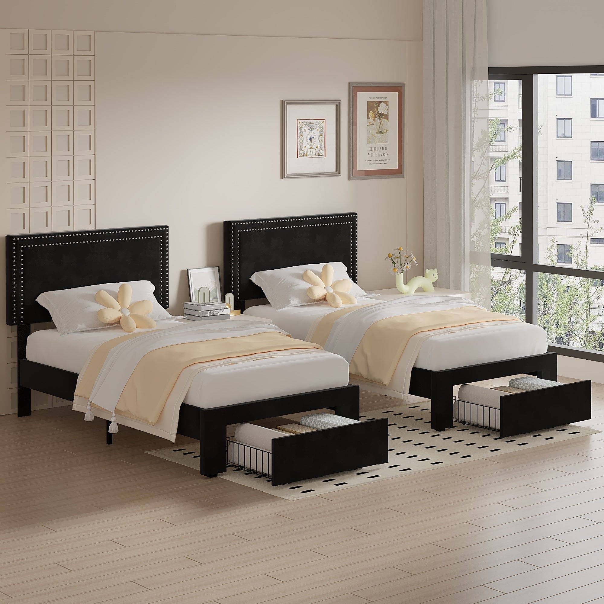 2 Pcs Kids Twin Bed Frame with Under-Bed Drawer Platform Upholstered Bed with Adjustable Headboard for Boys Girls Toddlers