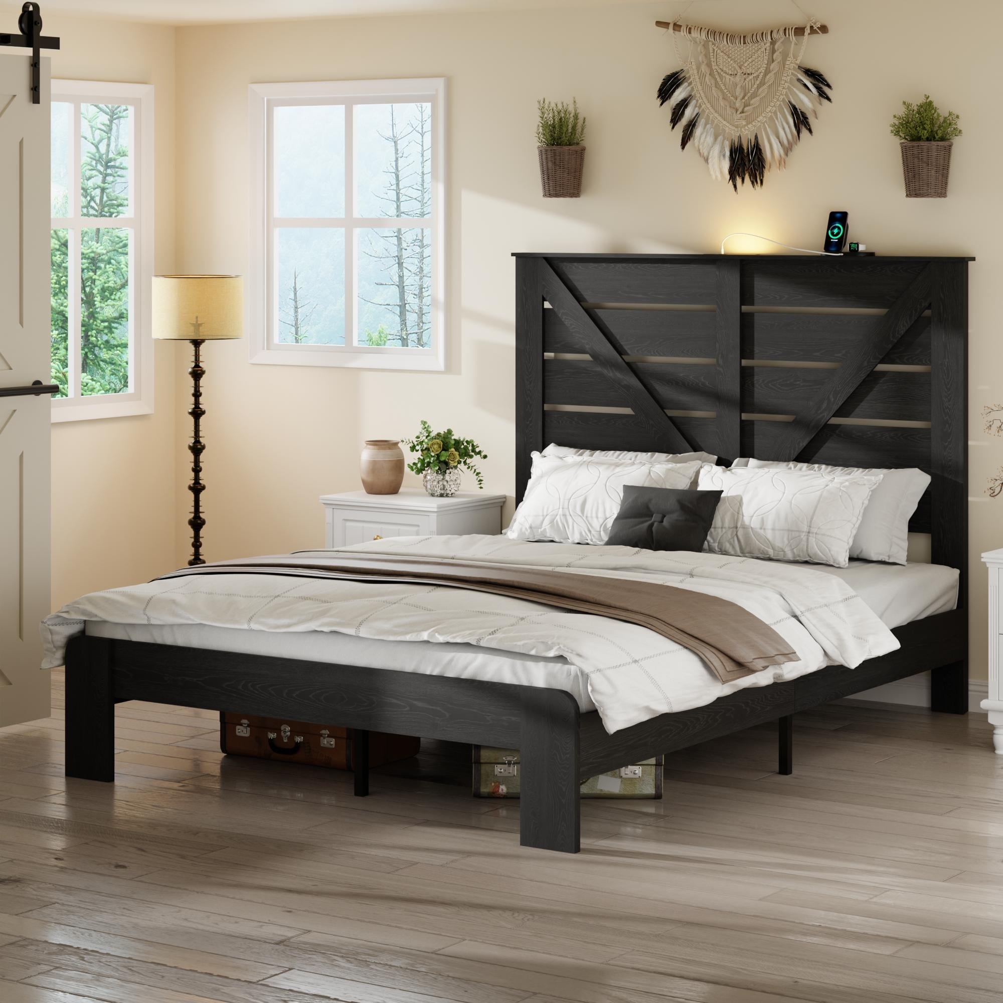 Full Size Wood Platform Bed Frame with Headboard, Noise Free, Easy Assembly, Large Under Bed Storage, Black
