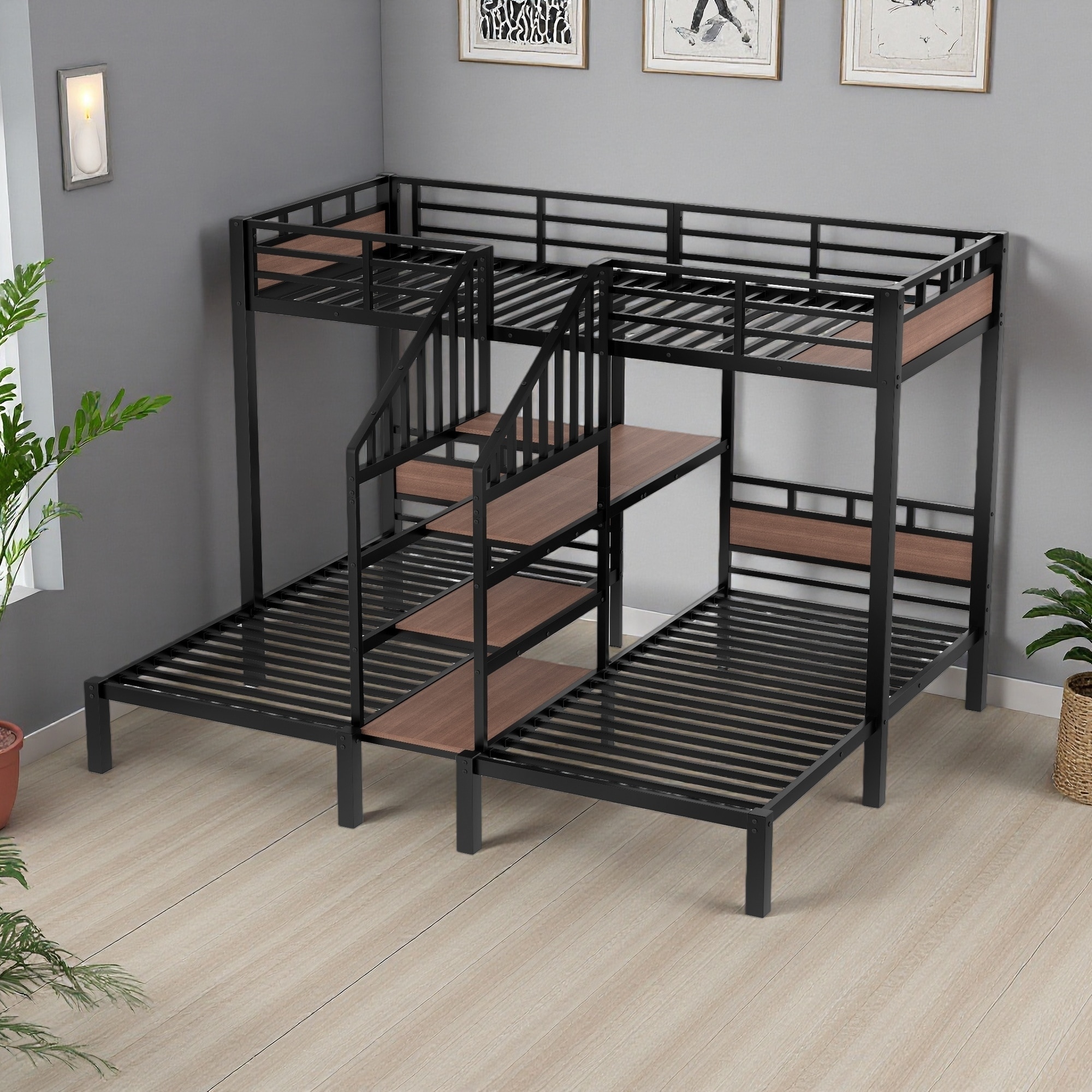 Full Size Metal Loft Bed with L-Shaped Desk, Shelves, and Storage Cabinet, Industrial Frame with Guardrails