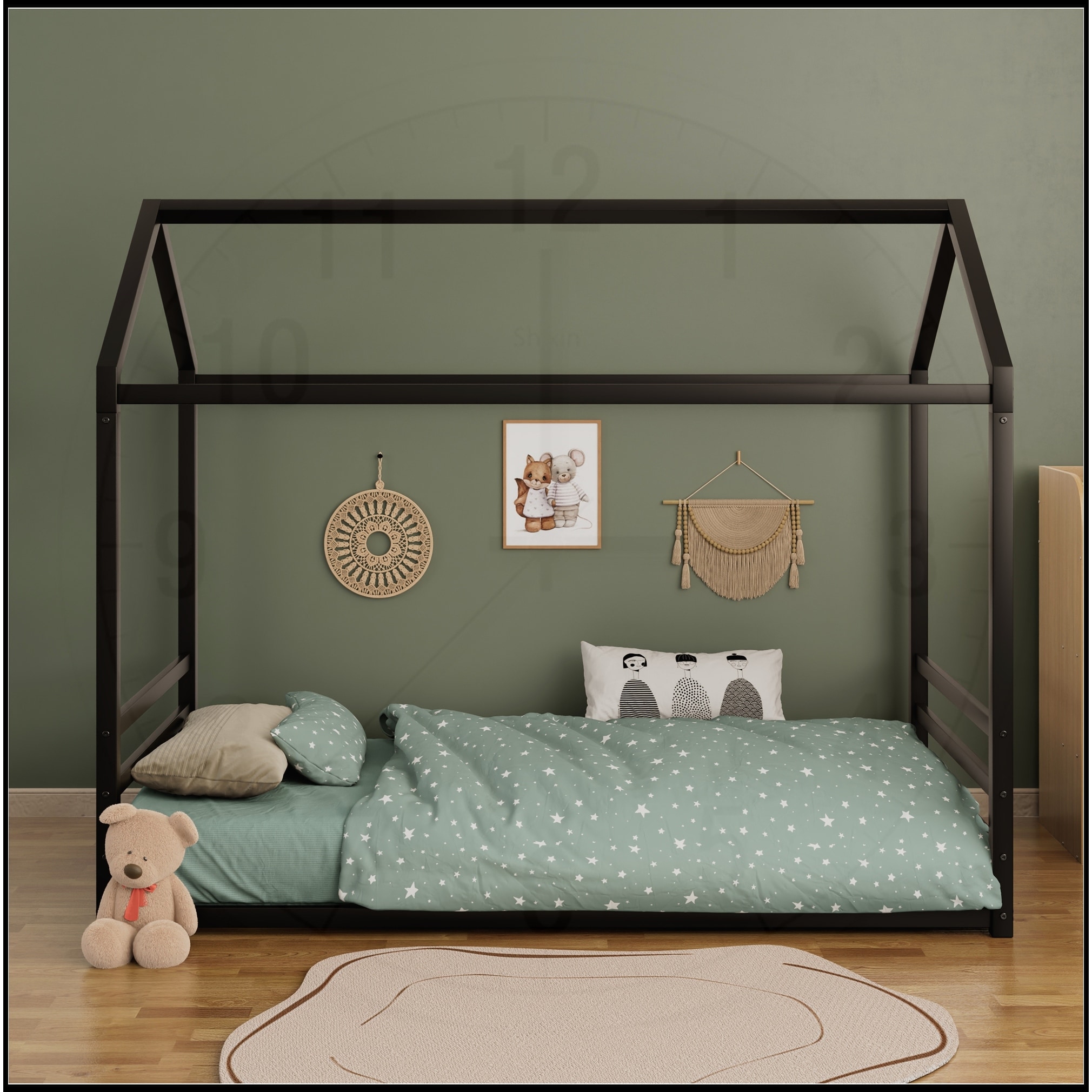 Full Size Wooden House Bed with Twin Size Trundle, Roof and Fence