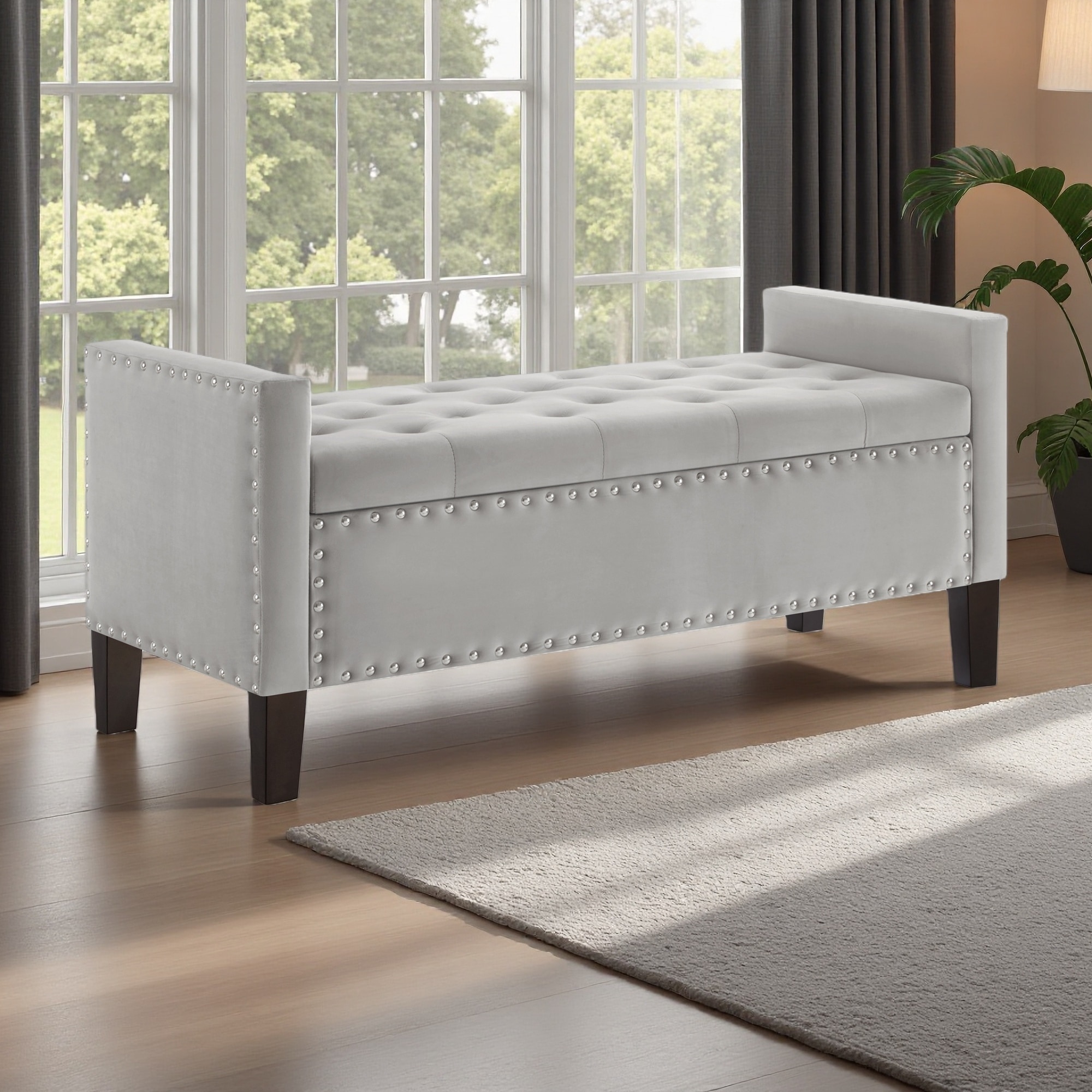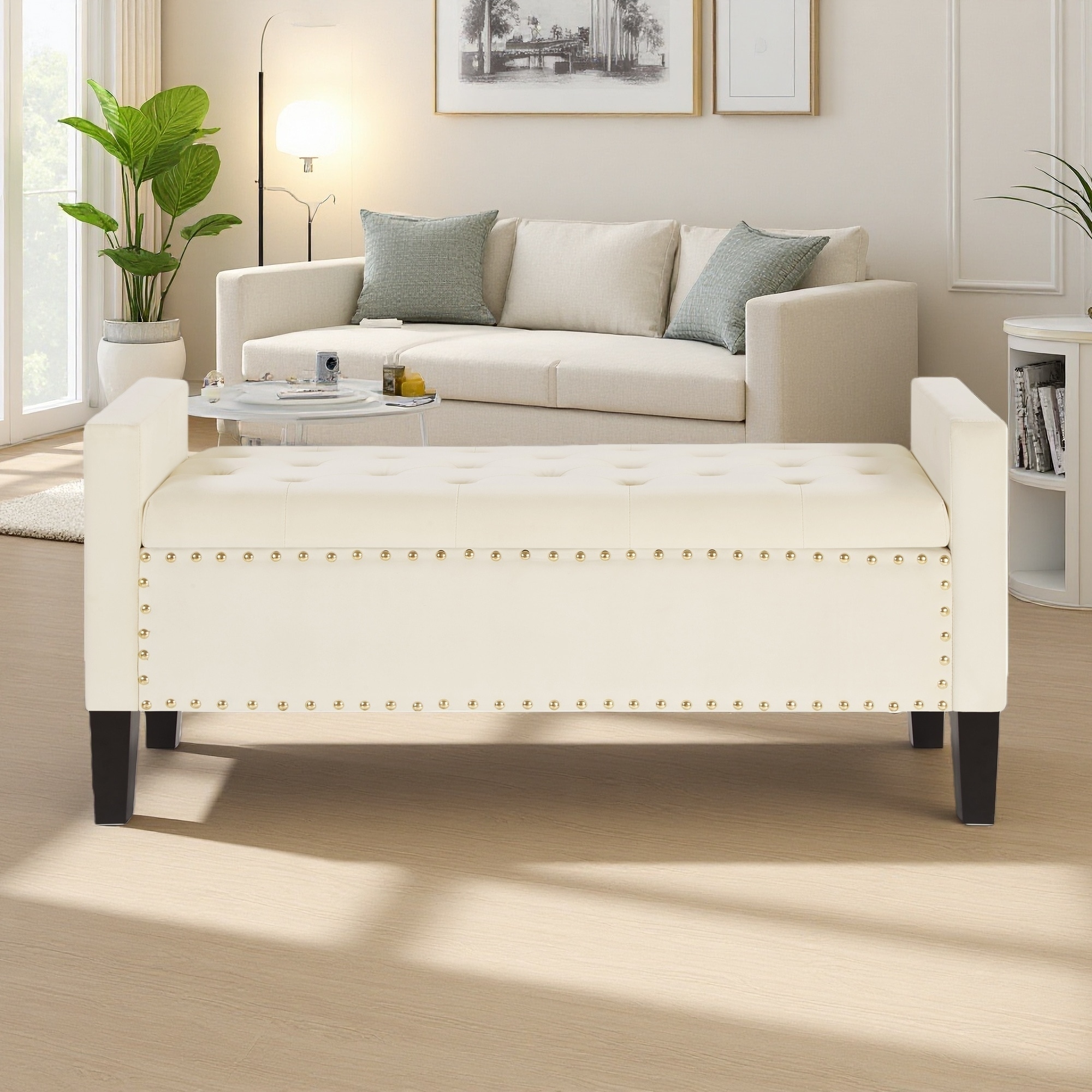 48"L Velvet Upholstered Tufted Button Storage Bench with Nail Trim and Armrest, Padded Seat for Entryway Living Room Bedroom