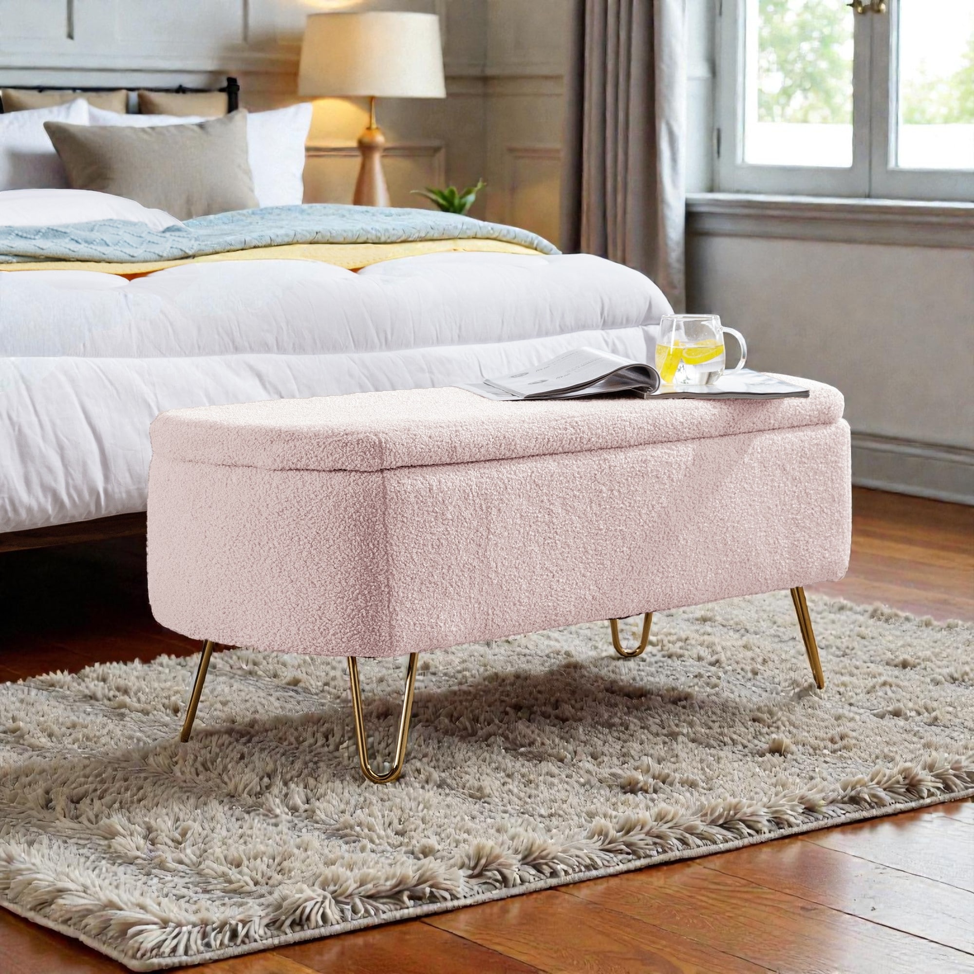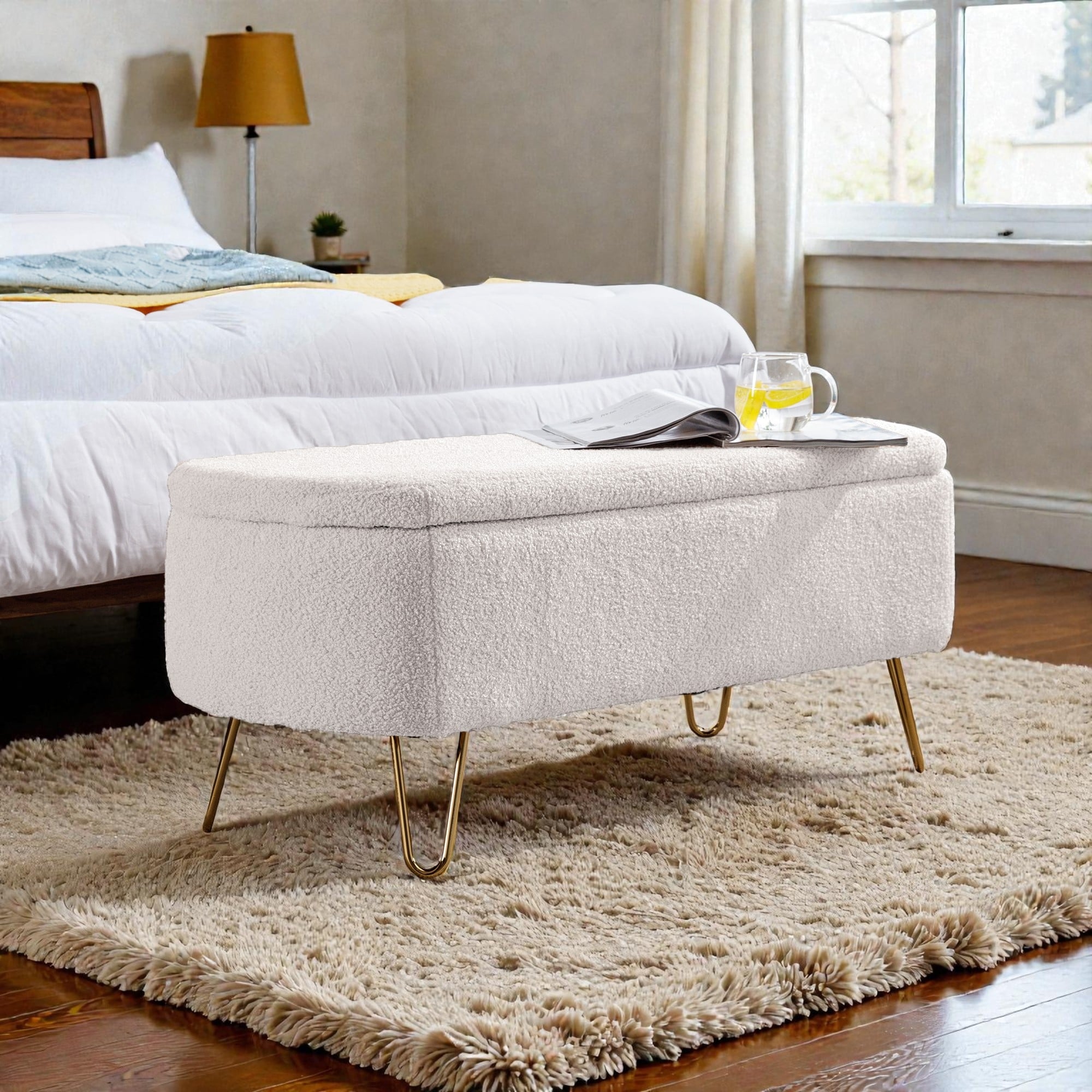 Upholstered Faux Fur Storage Bench with Gold Metal Legs, Entryway Ottoman for Bedroom, Living Room, End of Bed - faux fur