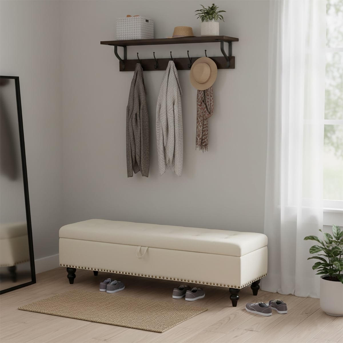 2-in-1 Hall Tree & Storage Cabinet for Living Room, Multifunctional Left-Right Combination Hall Cabinet with Bench and 4 Hooks