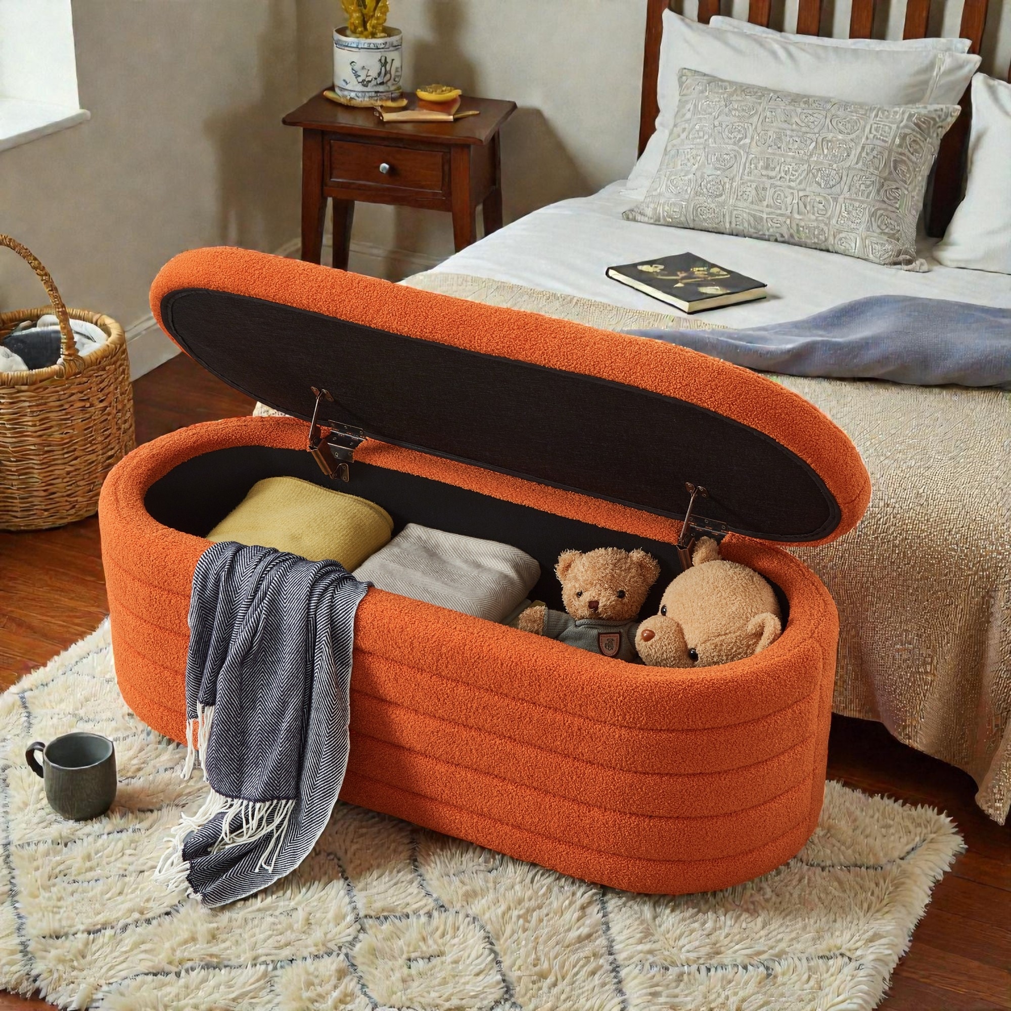 Oval Upholstered Storage Ottoman Bench with Teddy Fabric, End of Bed Bench with Hinged Lid for Bedroom Living Room Entryway