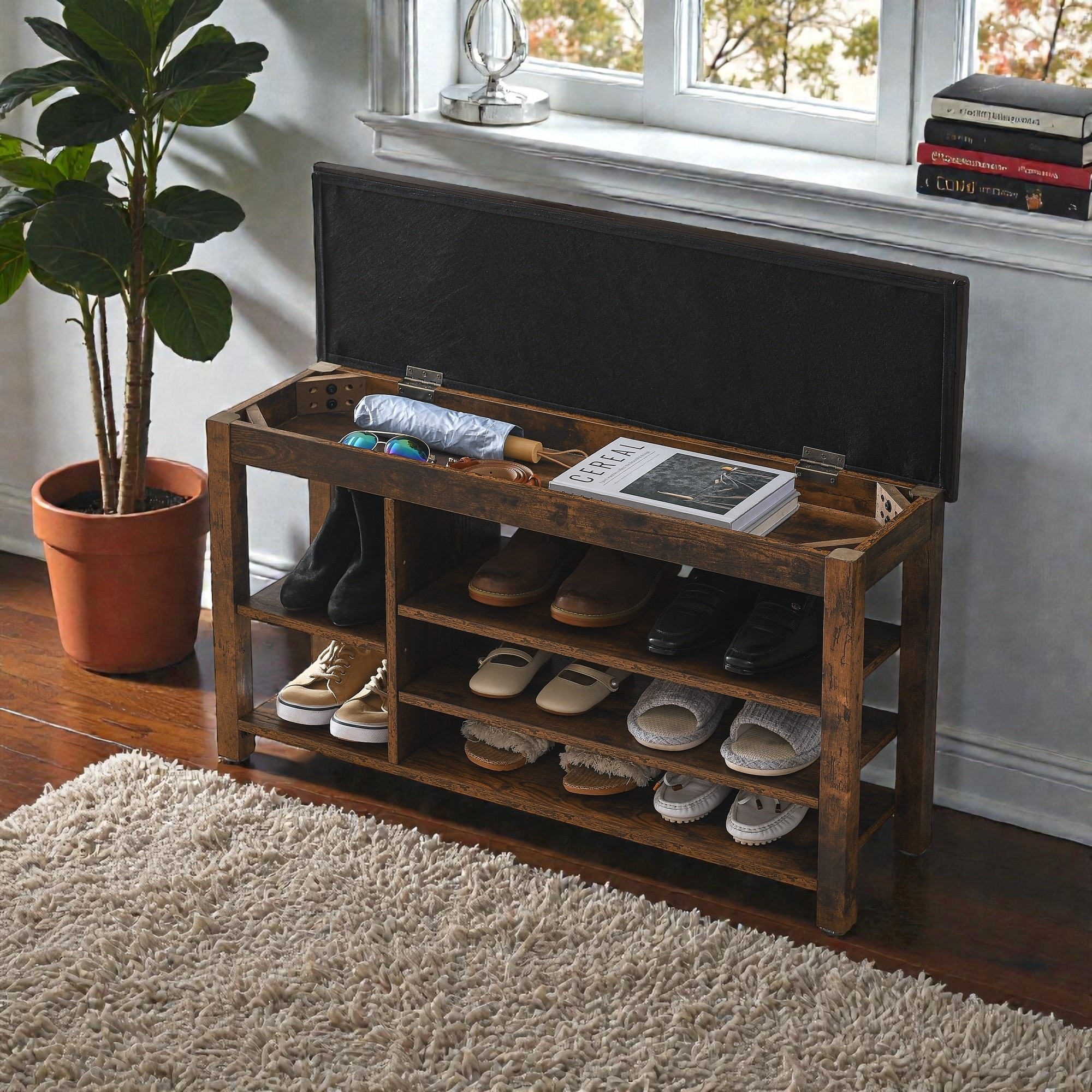 Shoe Changing Bench with Storage, Upholstered PU Seat and Rubberwood Frame, Entryway Storage Bench with Adjustable Height