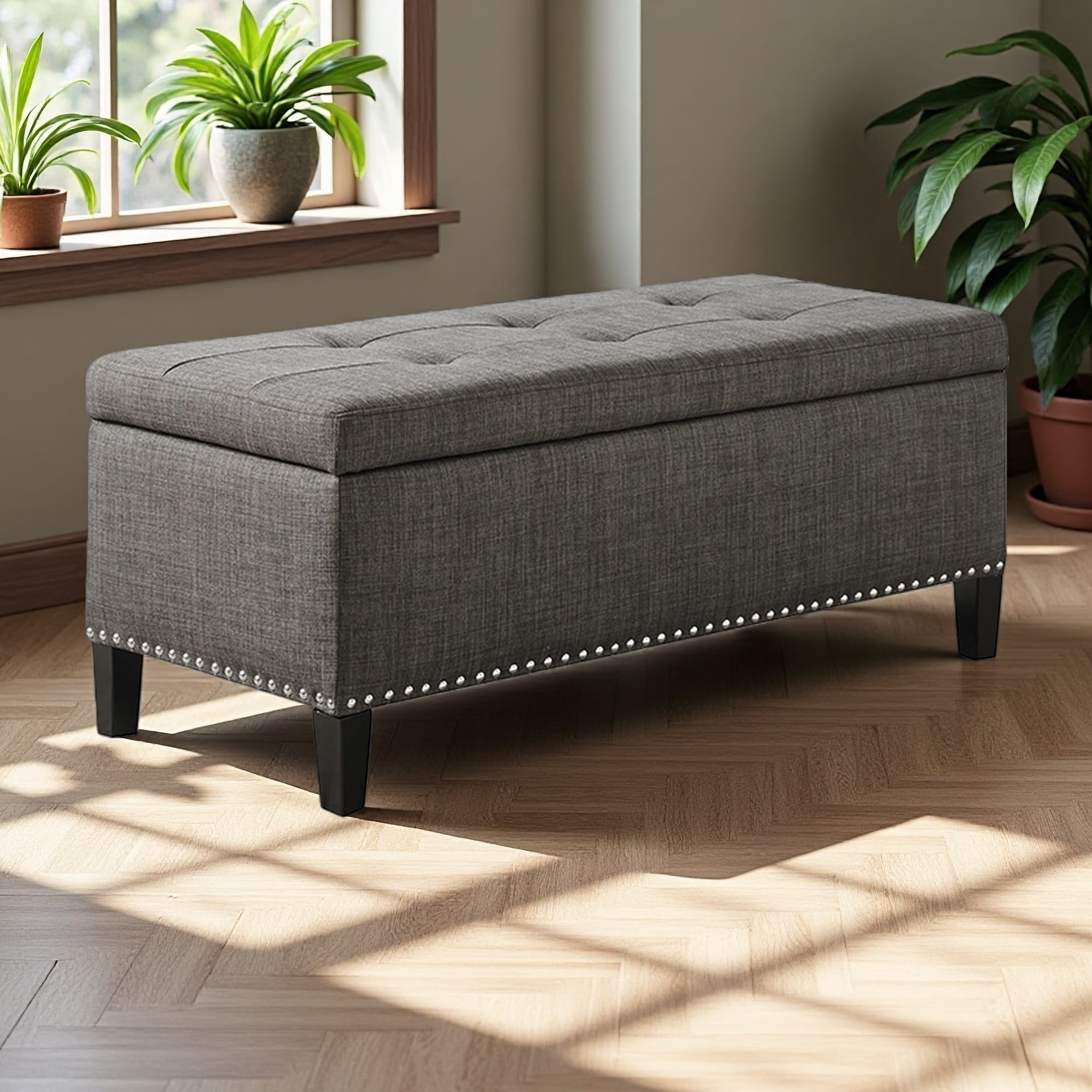 42"L Tufted Top Soft Close Storage Bench with Copper Nail Heads, Birch Legs, Linen Fabric, and 400 lbs Weight Capacity
