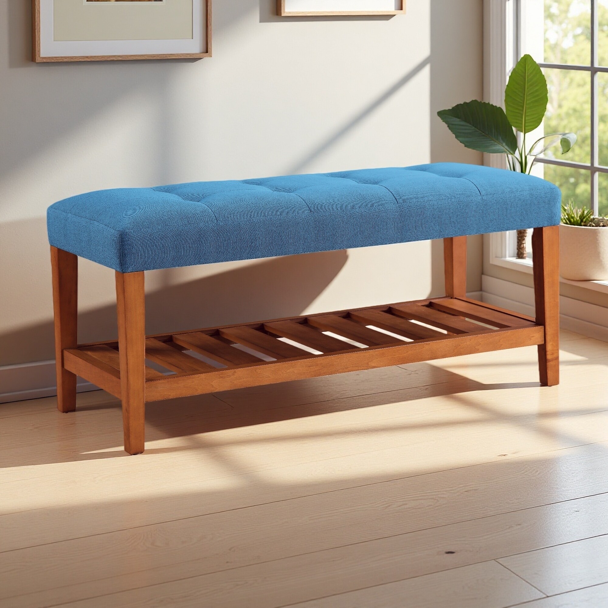 40"L Rectangular Lounge Bench with Tufted Polyester Upholstery, Open Shelf Storage, Minimalist Design