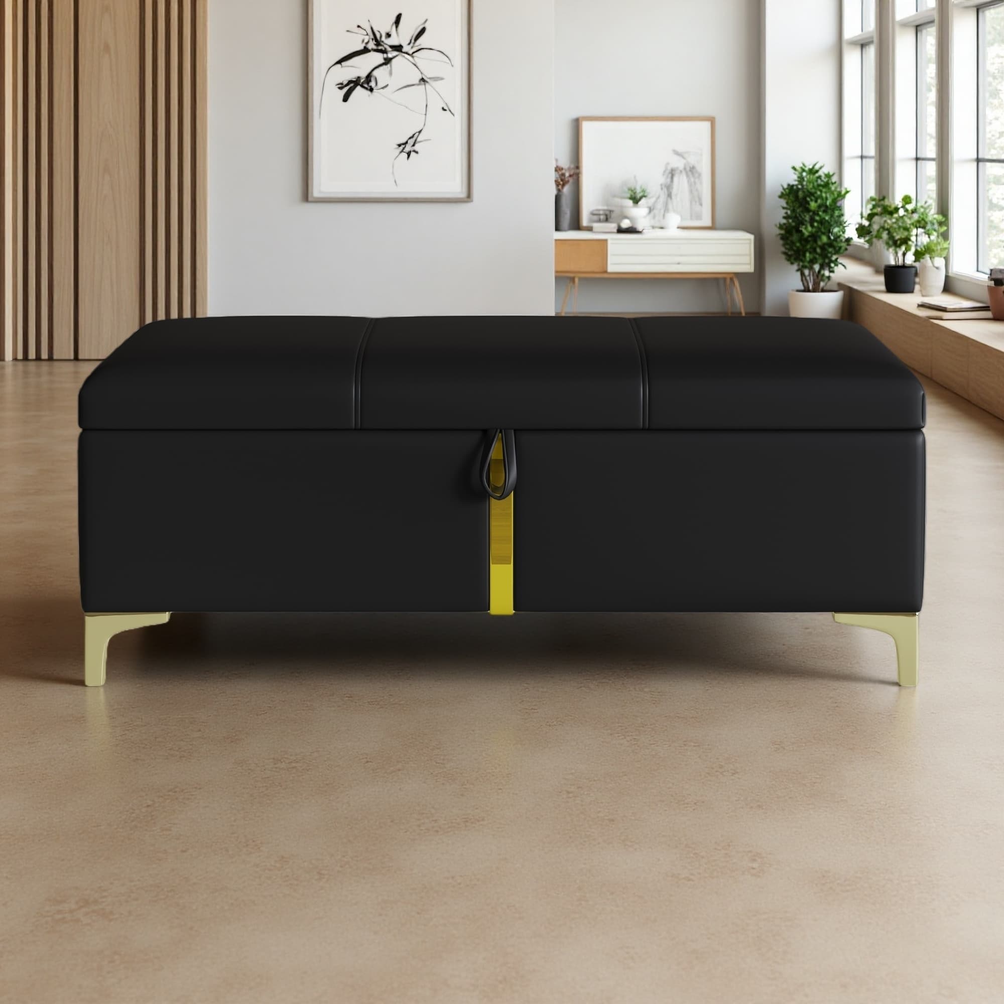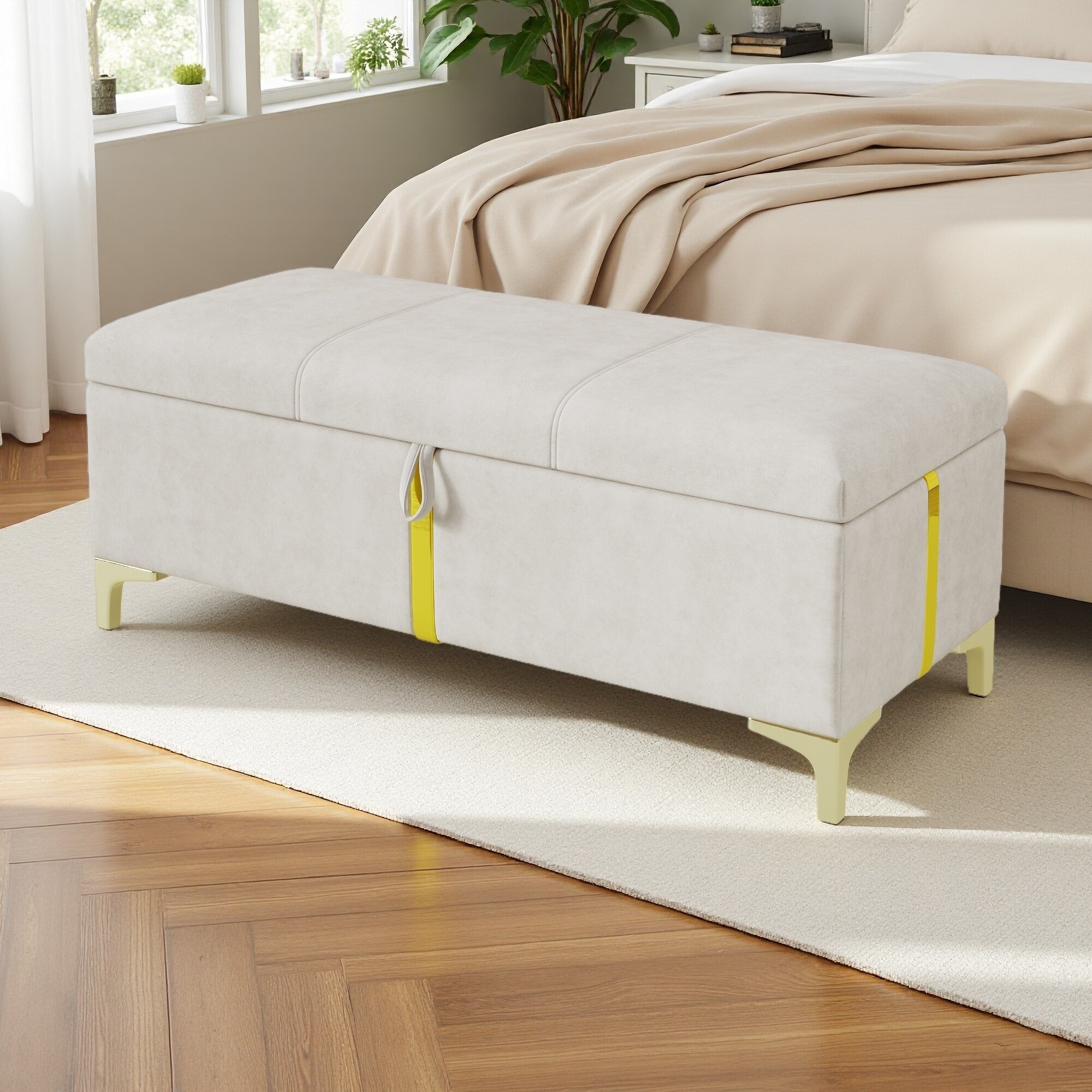 47"L Upholstered Storage Ottoman with Metal Legs, Soft Velvet Fabric, Gold Strip Accents, Storage Bench for Bedroom, Living Room