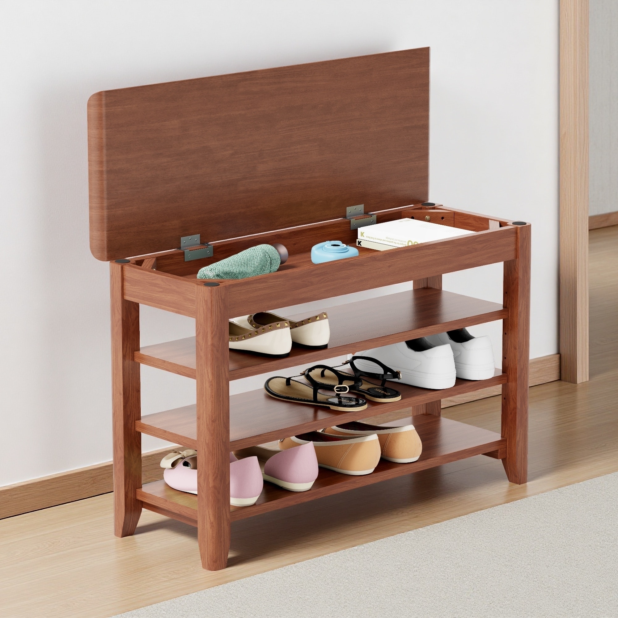 31.5"L Solid Rubberwood Front Door Shoe Rack, 3-Tier Adjustable Shoe Storage Bench, Compact Modern Design for Entrance, Corridor