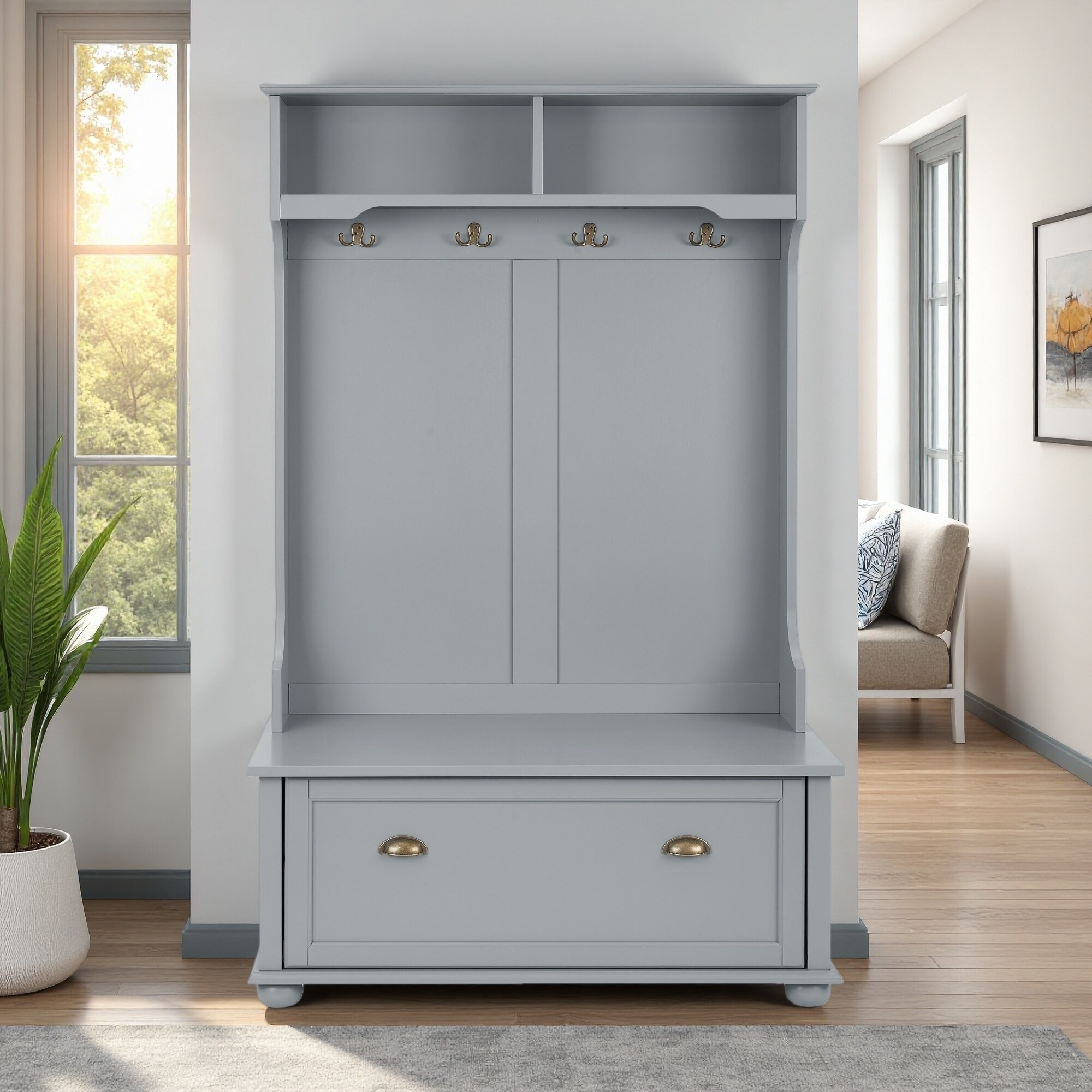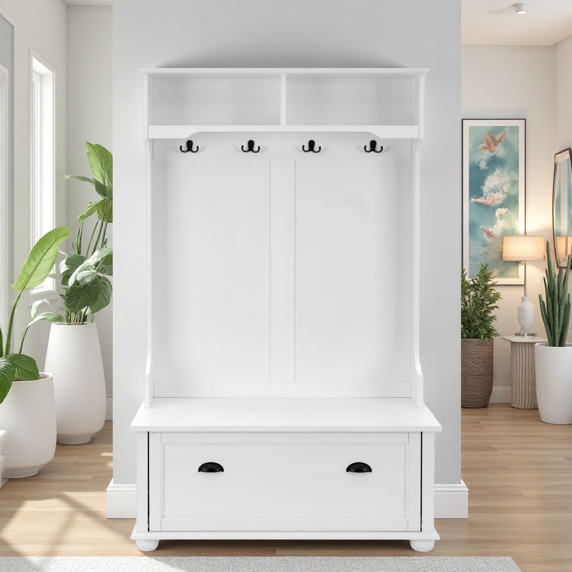 40"L Classic Coastal Style Hall Tree with Open Shelves, Shoe Cabinets & Solid Wood Feet, Easy Assembly, 4-in-1 Entryway Bench