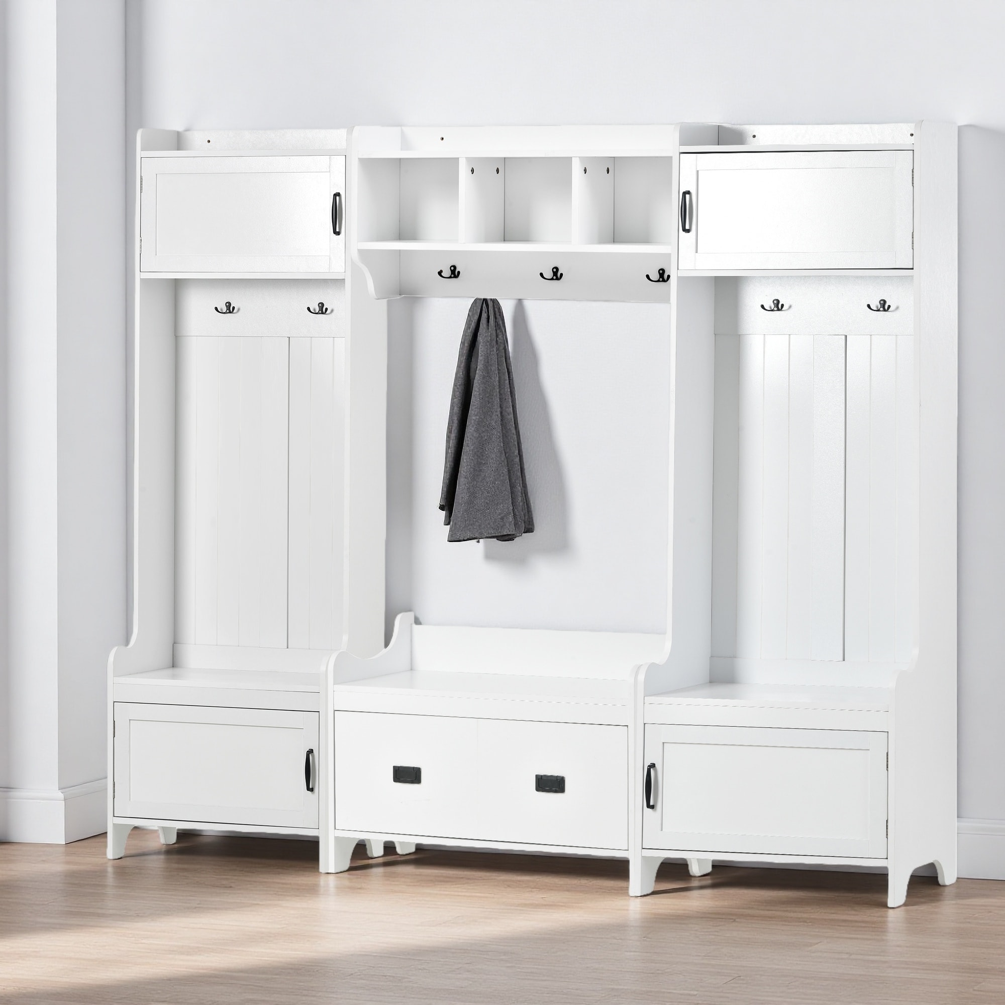 78.7"L Particle Board 4-in-1 Hall Tree with 7 Metal Hooks, Storage Bench, and 4 Cabinets for Entryway Organization