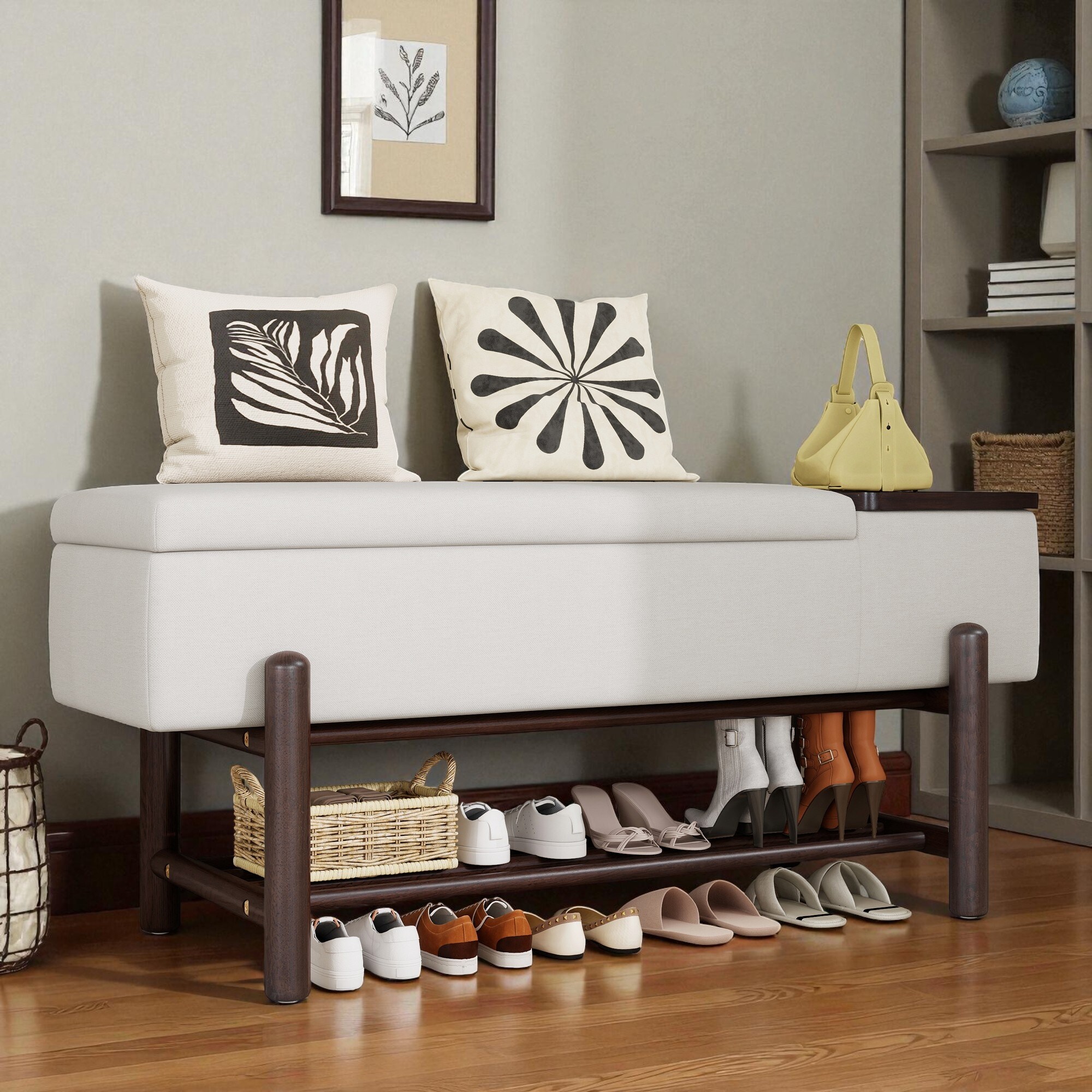 Upholstered Storage Bench with Hidden Compartment and Shelf, Entryway Shoe Bench with Cushion Seat and Wood Legs