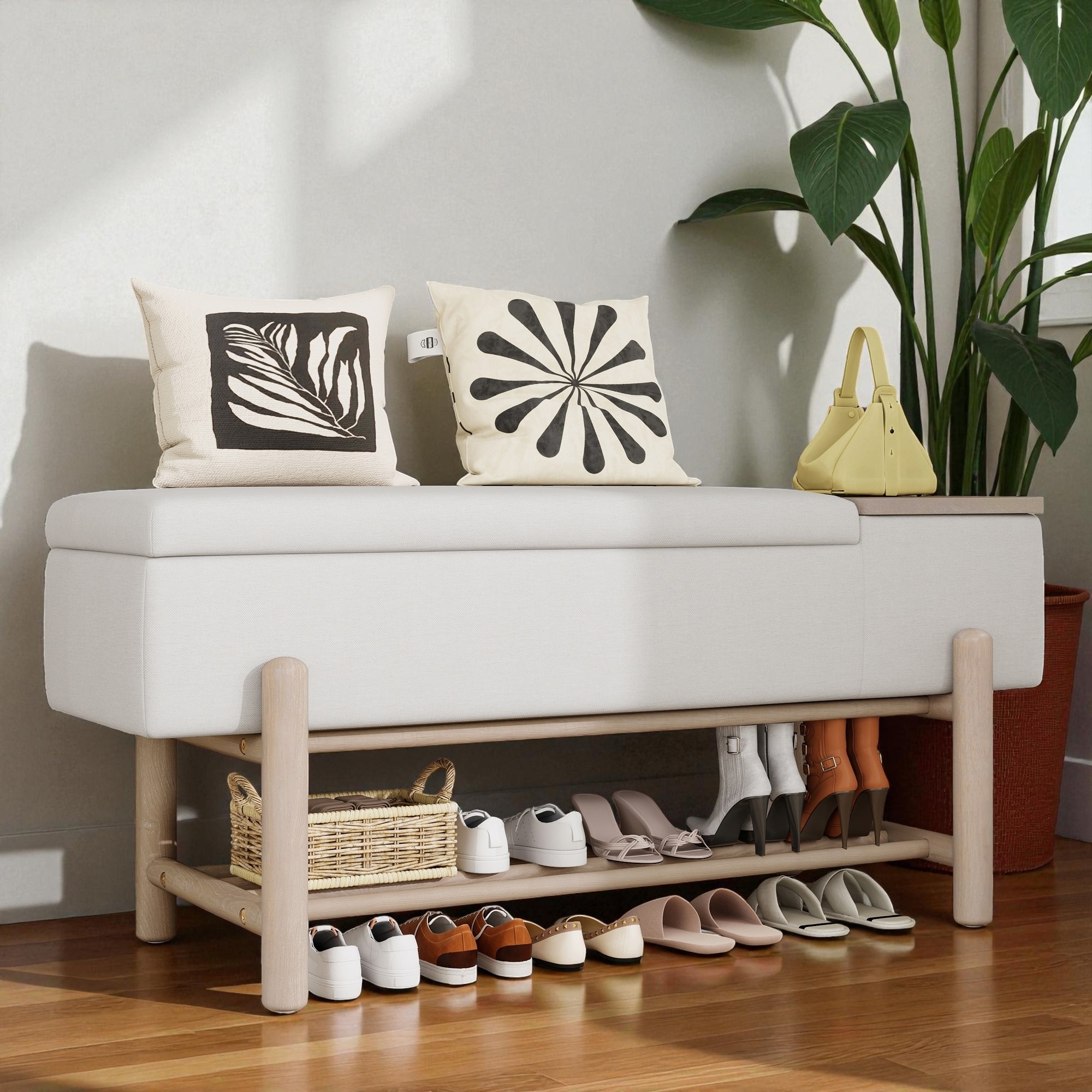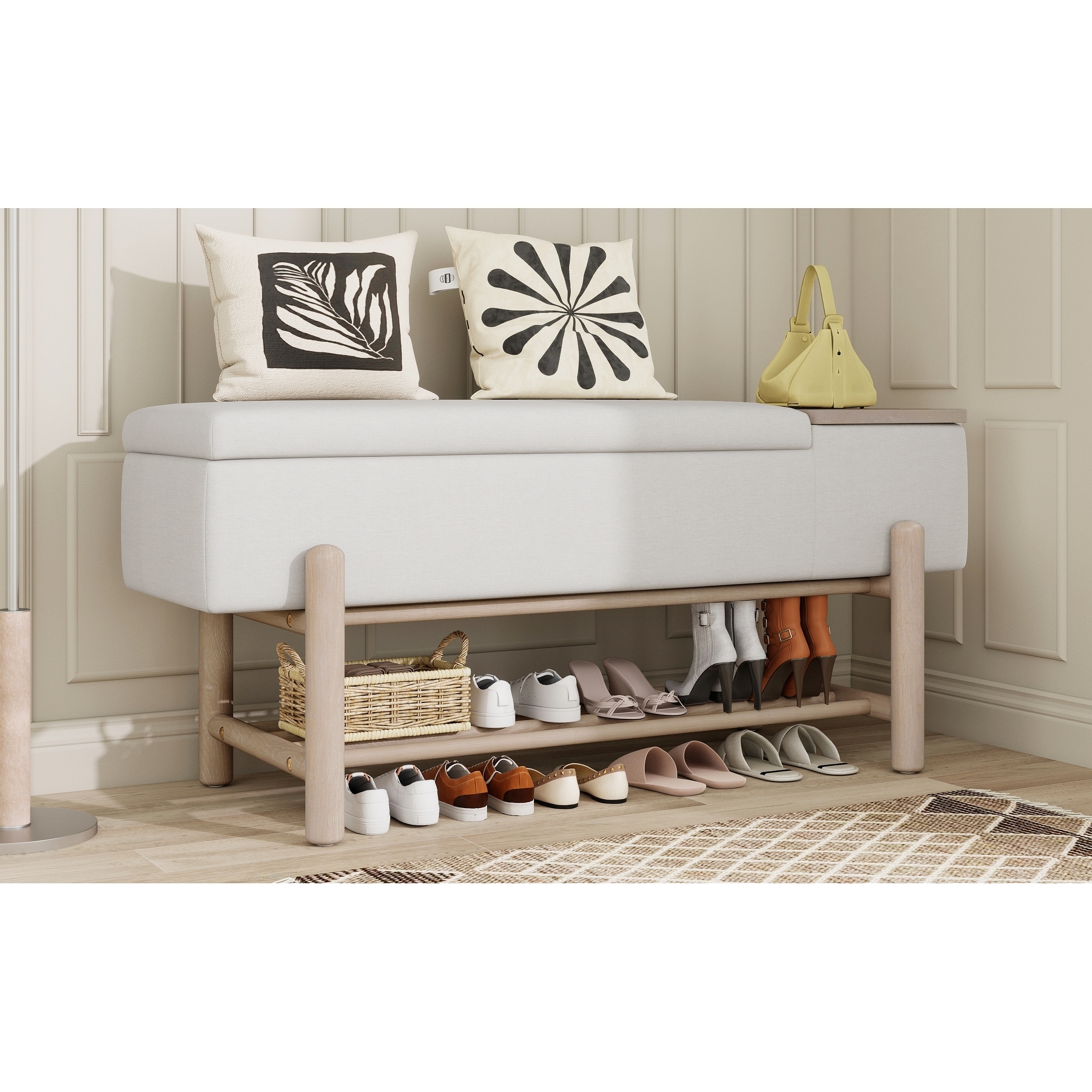 Upholstered Storage Bench with Hidden Compartment and Shelf, Entryway Shoe Bench with Cushion Seat and Wood Legs
