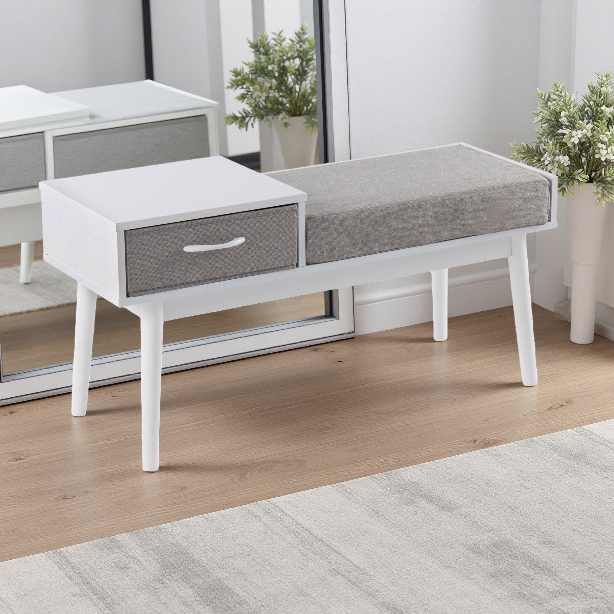 39.5"L Telephone Contemporary Bench in Wood and Fabric with Pull-Out Drawer and Multi-Purpose Design
