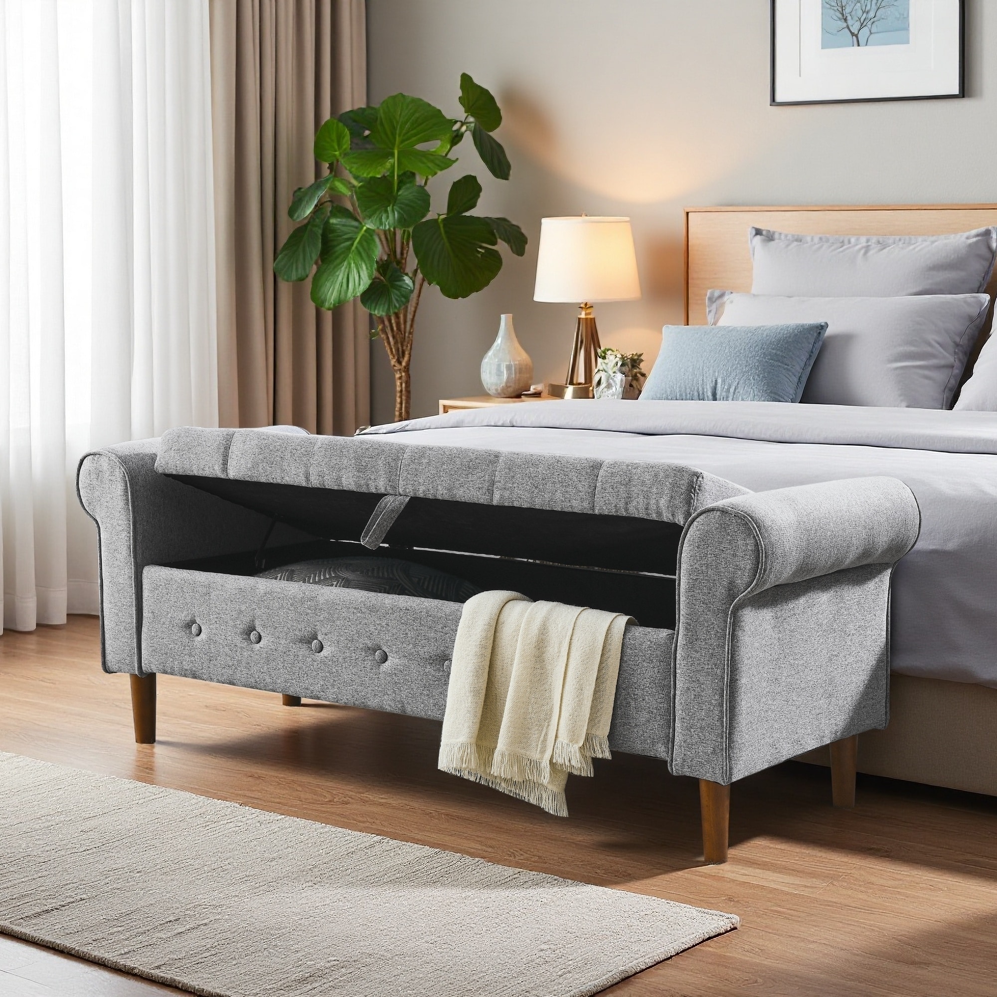 62"L Fabric Upholstered Tufted Button Storage Bench, Rolled Arm Ottoman for Bedroom, Foyer, with Hidden Storage and Seating