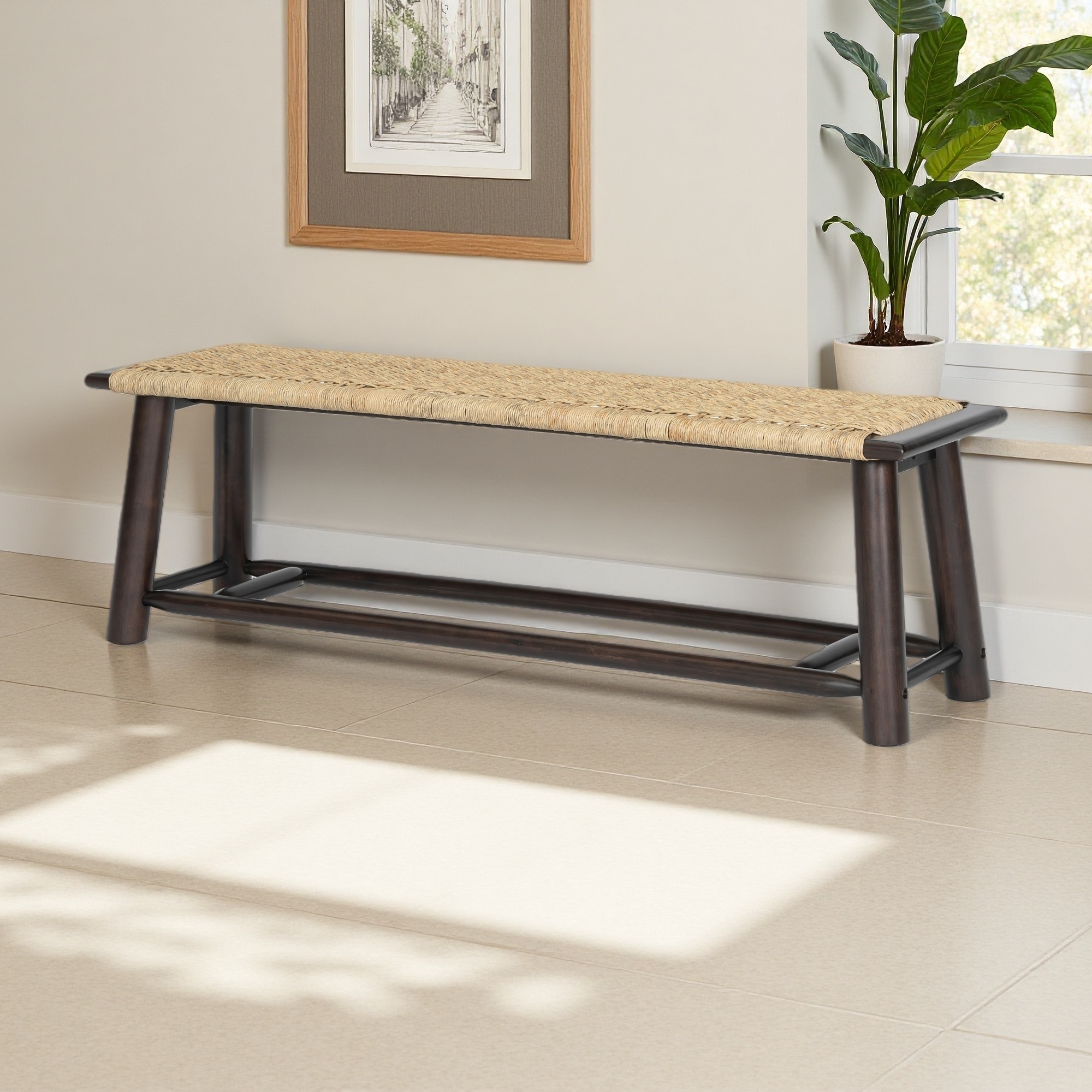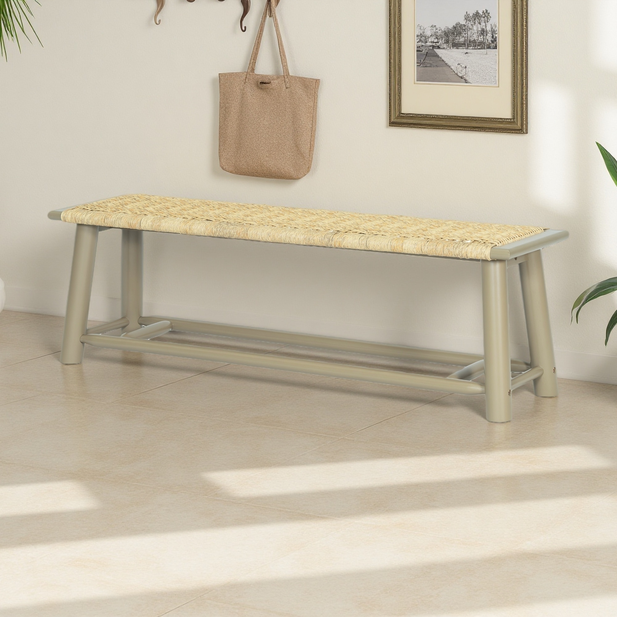 59"L Solid Wood & Handwoven Rattan Bench with Tapered Legs, Multi-Functional Farmhouse-Modern for Indoor & Covered Outdoor Use