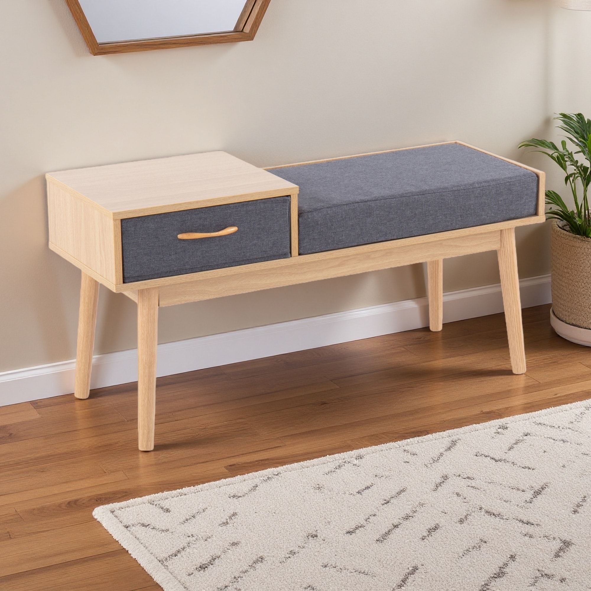 39.5"L Telephone Contemporary Bench in Wood and Fabric with Pull-Out Drawer and Multi-Purpose Design
