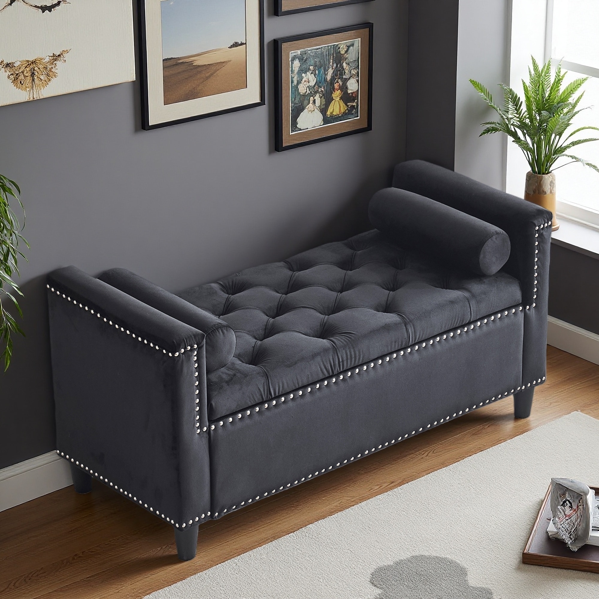 44.5"L Velvet Upholstered Storage Bench with Armrests and Nailhead Trim, Multifunctional Bedside Ottoman, Living Room Bench