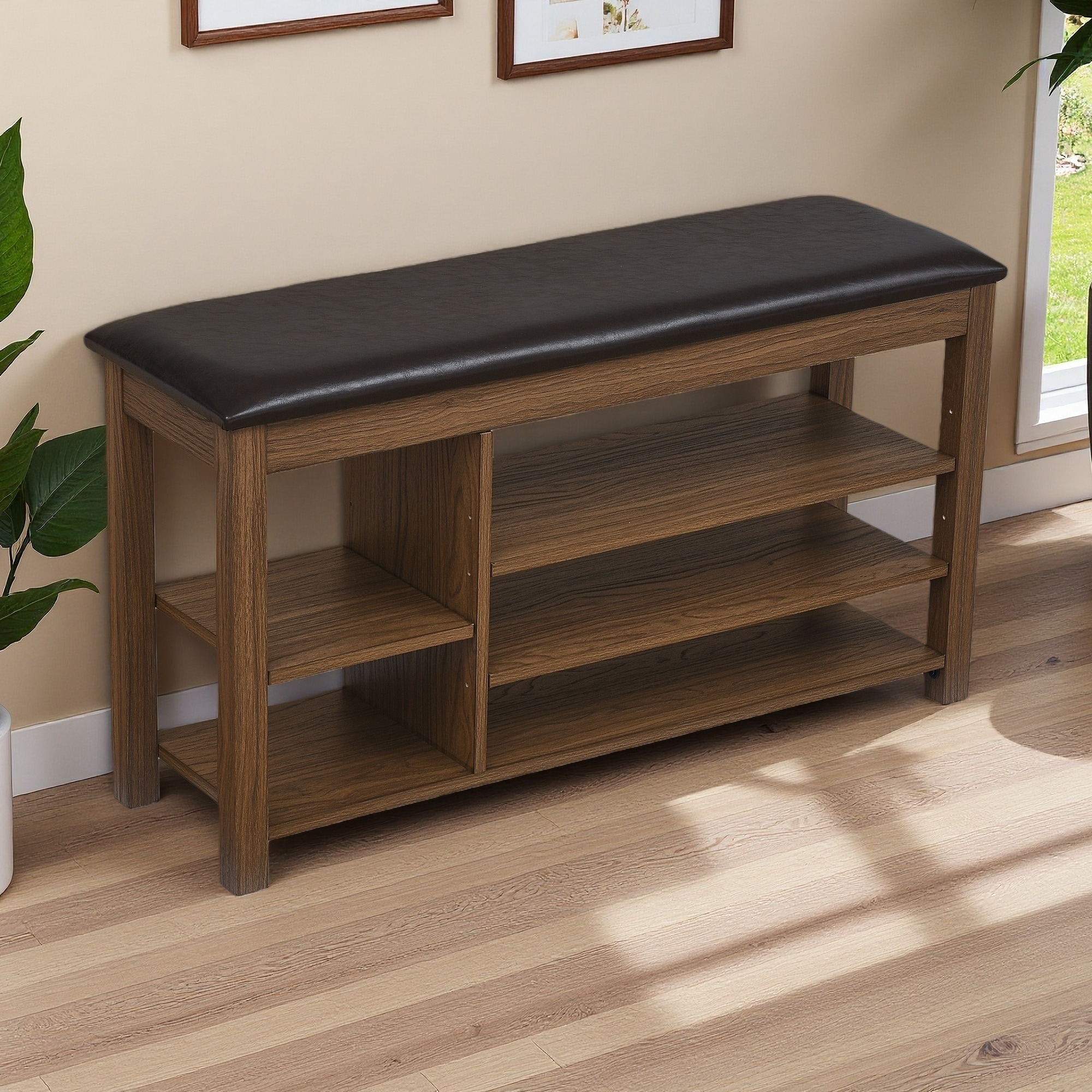39.5"L Height-Adjustable Rubberwood Shoe-Changing Bench with PU Leather Cushion, Concealed Storage, Compartments & Wood Grain