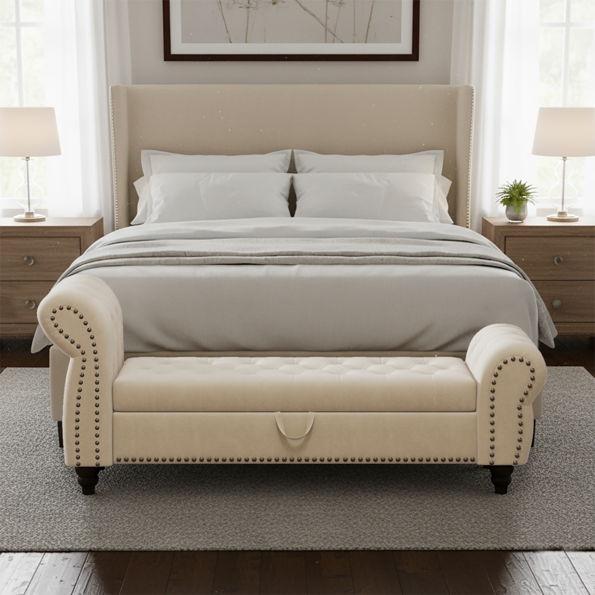 Elegant Stylish Velvet Upholstered Storage Bench with Solid Rubberwood Legs
