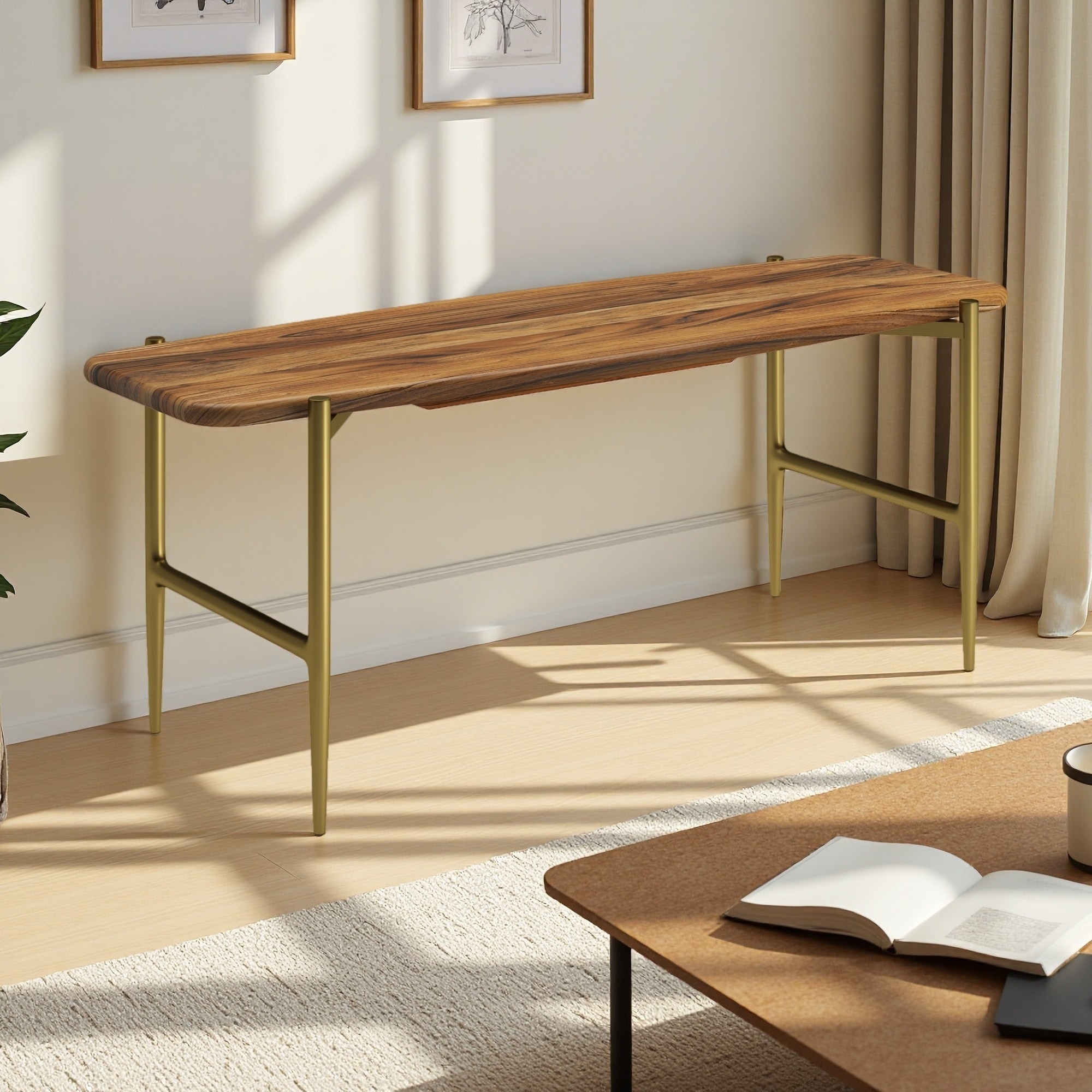 46"L Solid Acacia Hardwood and Metal Multi-Functional Bench with Antique Brass Support, Mid Century Design, and Extra Thick Seat