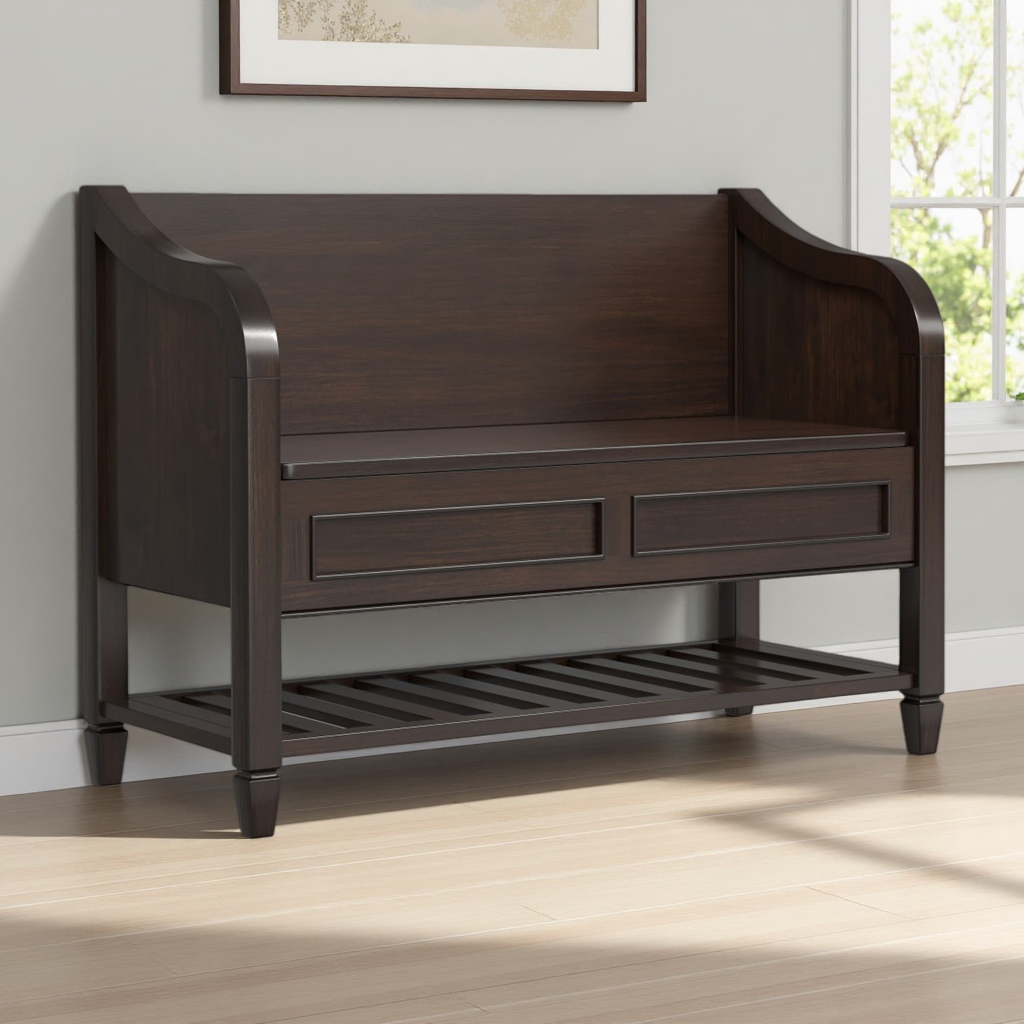 42"L Solid Wood Multi-Functional Storage Bench with Lift-Up Lid, Dual Storage Compartments, Bottom Shelf, and Vintage Design