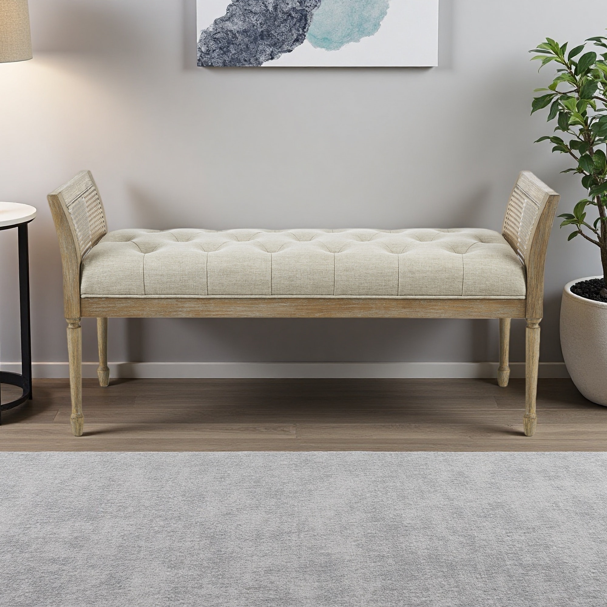 48.5"L Transitional Bench with Solid Wood Frame, Tufted Upholstered Seat & Cane Side Frames - Turned Legs, 400lbs Capacity